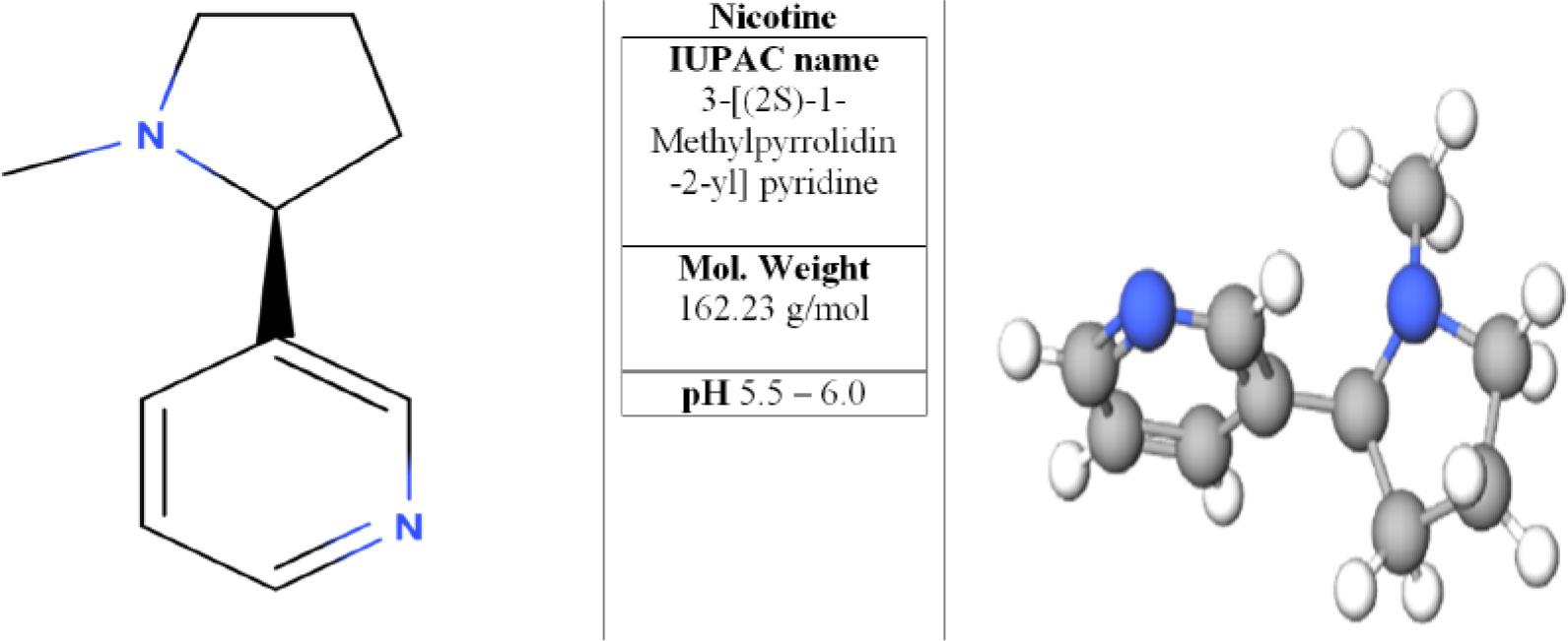 Nicotine, a vital element in tobacco, is known for its addictive properties and psychotropic effects. It has a molecular weight of 162.23 g/mol and a pH of 10.2 (Figure 2). The liquid form of nicotine ranges from colourless to light yellow, and it is toxic when absorbed through the skin or inhaled. Nicotine is a combustible substance that produces harmful nitrogen oxides upon burning. Nicotine’s pike value is around 8.11 to 8.1, and its log Kow value is 1.17 (hydrophobic), which represents the octanol/water partition coefficient expressed as a dimensionless ratio value, typically assessed using the decadic logarithm (denoted by “log”). It quantifies the distribution of a compound between octanol and water phases [11].