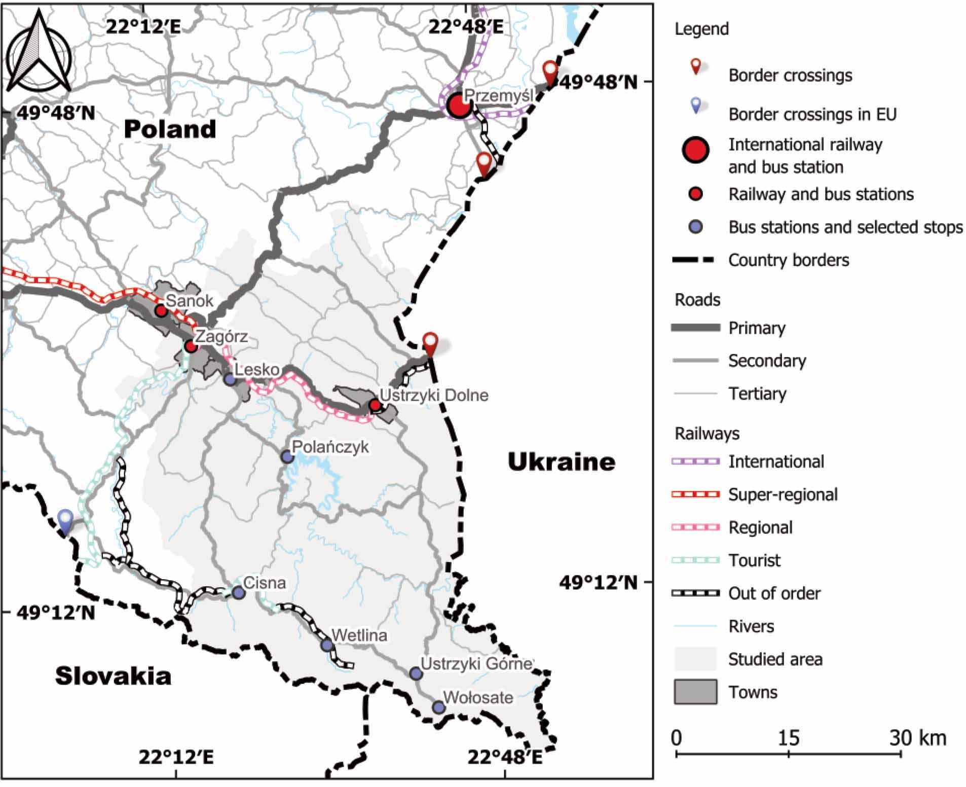 The analysis of public and road transport within an hour from the Polish-Ukrainian border clearly shows that the last south road border crossings are the Ustrzyki-Krościenko (on the Polish side) – Smolnica (on the Ukrainian side) road, pedestrian, and railway crossing (Fig. 3). The nearest road border crossings on the Polish-Slovak border are Palota – Radoszyce and Komarnik – Barwinek, and operating on a limited scale and rather seasonally railway Medzilaborce-Łupków, historically built as Transcarpathian Railway Route to connect Hungary with Galicia, the cities of Budapest – Lviv. There was also a former pedestrian border crossing, Przełęcz nad Roztokami Górnymi. However, many tourist trails and links run across the Polish-Slovak border, which allow for free and easy transboundary hiking or even cycling, e.g., Rabia Skała, Przełęcz nad Roztokami Górnymi with R61 Greeway Eastern Carpathians – a bicycle trail. The trail runs along a historical route and mountain pass, which has been used since the 16th century as an important trade route and link between Lesser