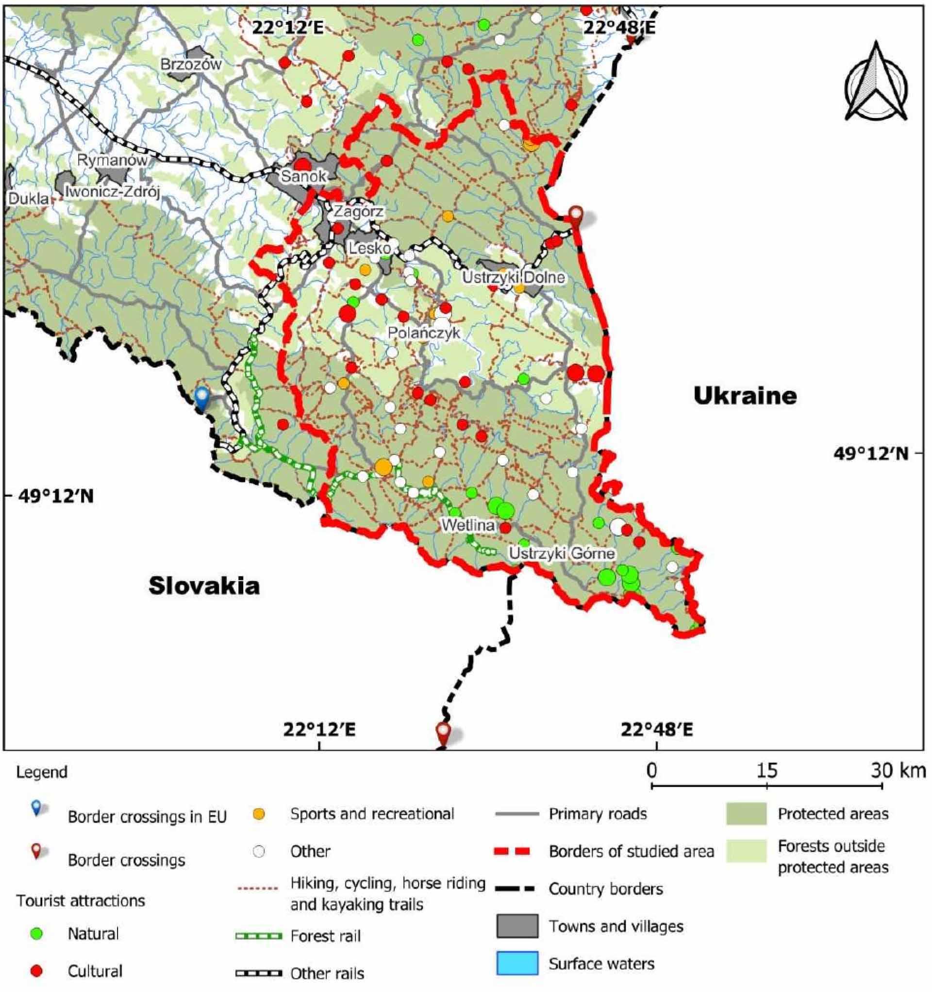 The Carpathian Mountains are Europe’s vital heart for the eight countries in terms of geographical, natural [1], economic, cultural, social, and recreational environments. This is why it is so important, on a European and regional scale, to protect the potential of this area and, at the same time, find proposals for sustainable development. The research described in this paper focuses on the regional spatial and functional development enhancement of the southern Polish border region of the Wooded Beskydy, part of the Eastern Beskydy Mountains (known as Bieszczady in Poland), based on selected and tailored research with several analyses of connections and potential. The area’s old development history and wealth result from its location on important historical international trade routes. From the 14th to the beginning of the 18th century (due to the partitions of Poland), the area belonged to Poland, then became part of Galicia under Austrian rule, only to return to a reborn Poland in 1918-39 [2]. After World War II, as a result of a change in borders, the area was divided between Poland and the former Union of Soviet Socialist Republics (USSR) [3], changing the identity of the region and breaking the spatial connections that had been created naturally over the previous centuries. Though densely populated before 1945, the Beskydy became scarcely inhabited, which, along with the low economic development in the area, paradoxically determined their significant ecological and cultural values. The housing and service facilities, Greek Orthodox Churches, sawmills, and mills, along with the fields and pastures of the abandoned villages, began to be taken over by nature. The mountain ridges became covered with forests, and the fields became fallow land. On the Ukrainian side, the changes have been minor. It is still the centre of authentic life for the Boykos ethnic group. Less urbanization and preserving the natural landscape have created the basis for a tourism-based economic model. At the same time, knowledge of the local area is often the basis for cooperation [4].