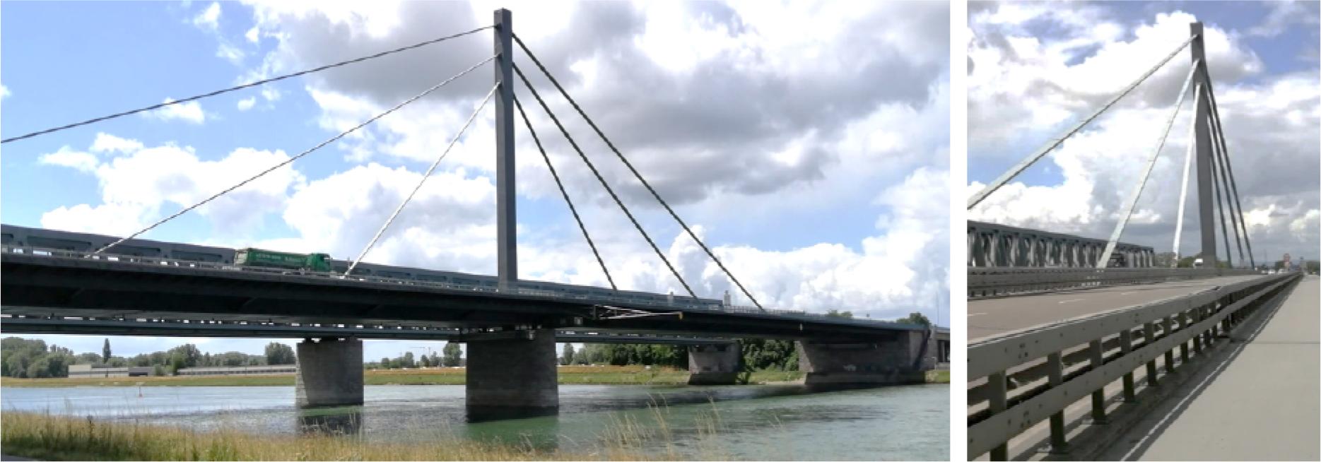 The analyzed structure is a steel cable-stayed bridge located between Karlsruhe-Maxau and Wörth am Rhein (Germany) on the border of the Rhineland-Platinate and Baden-Württemberg states (Figure 1). Crossing the Rhine River, this bridge is located on the six-lane A10 highway and is one of the most important transport facilities, enabling transit to France.