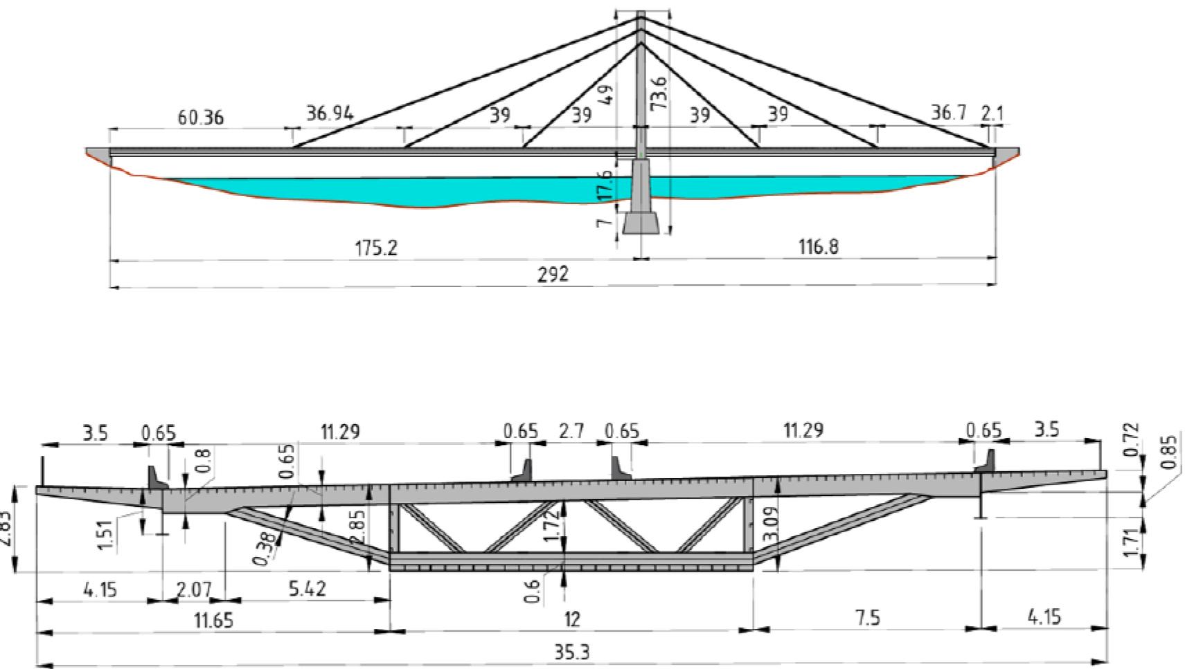 The bridge structure consists of two spans with lengths of 175.2 m and 116.8 m, reaching a total bridge length of 292 m. The total width of the bridge deck slab is 35.3 m. The operational part consists of two roadways, each with three traffic lanes, with a total width of 11.29 m, and pedestrian and bicycle paths on both outer sides of the deck slab, 3.5 m wide. The basic dimensions of the structure are shown in Figure 2.
