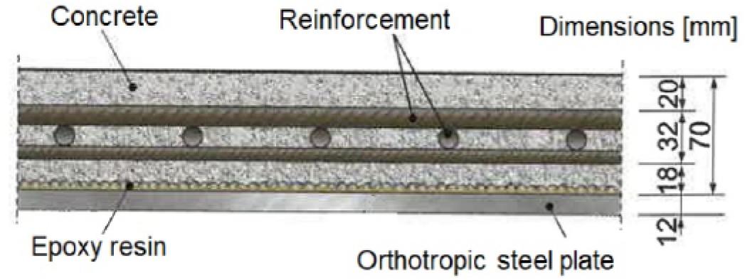 The bridge structure is designed as a steel box girder supporting a composite deck slab consisting of an orthotropic steel slab bonded with bonding fasteners and epoxy resin to a 7 cm thick UHPC concrete layer. The cross-section of the bridge slab is shown in Figure 3.