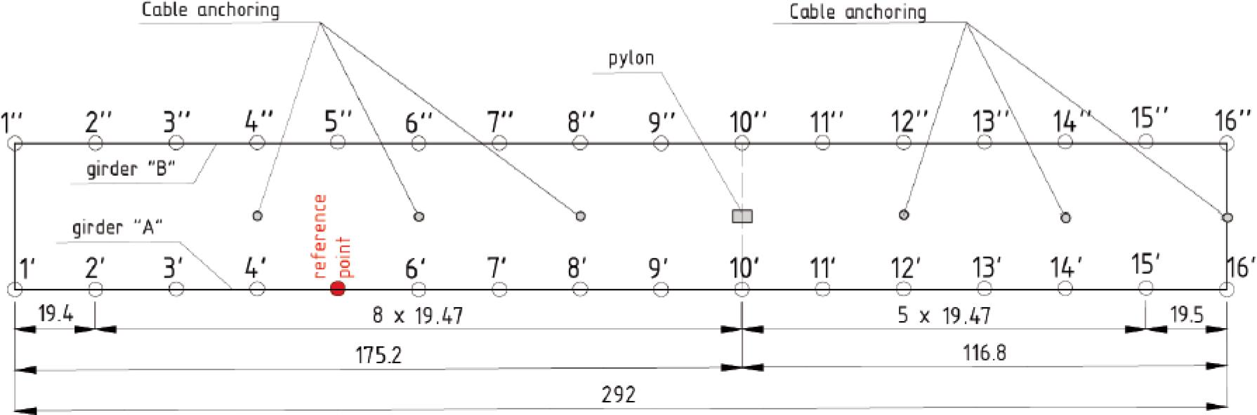 The dynamic response of the bridge deck was measured using accelerometers. The research work on the bridge presented in this publication, including measurements of vibrations of its structural elements and their analysis, was carried out in its entirety only by the co-authors of this publication. The measurement set-up consisted of four high-sensitivity, low-noise, single-axis accelerometers type PCB 3711E112G, manufactured using Micro-ElectroMechanical System (MEMS) technology, connected by low-noise cables with a 4-channel dynamic signal analyzer type DT9837A. The vibration accelerations were recorded in such a way that the fixed sensor was placed at the reference point of girder “A” near the mid-span of the longer bridge span. The three remaining sensors were placed successively at each of the selected measurement points, i.e. from point 1' to point 10' along girder “A”, and from point 1" to point 10" along girder “B”. These points were located mainly at a distance of 19.47 m, which corresponds to the length of one repeatable structural segment of the bridge span. The reference point was selected in the place where the largest number of dominant frequencies in the dynamic response spectrum was initially identified. Such a sensor configuration allowed for determining the natural vibration mode shapes. A draft of the measurement points distribution on the bridge girders is shown in Figure 4.