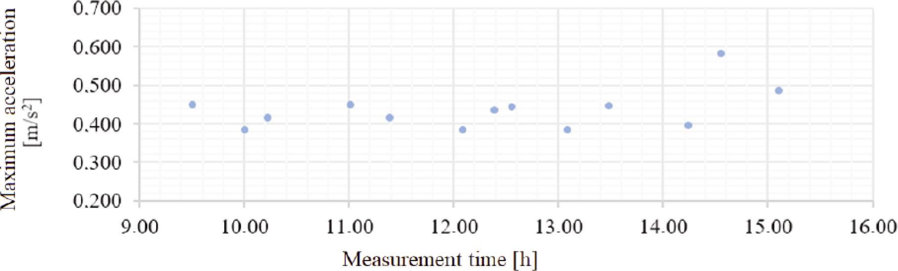 To estimate the maximum variability of the bridge vibration accelerations during the measurement period, data recorded at the reference point of the longer span between 9:27 and 15:05 from thirteen 10-min measurement cycles were analyzed using the PP technique. The change in vibration accelerations and the values of the first three natural frequencies of the bridge-vehicle system, resulting from the random nature of road traffic on the bridge, are shown in Figures 5 and 6.