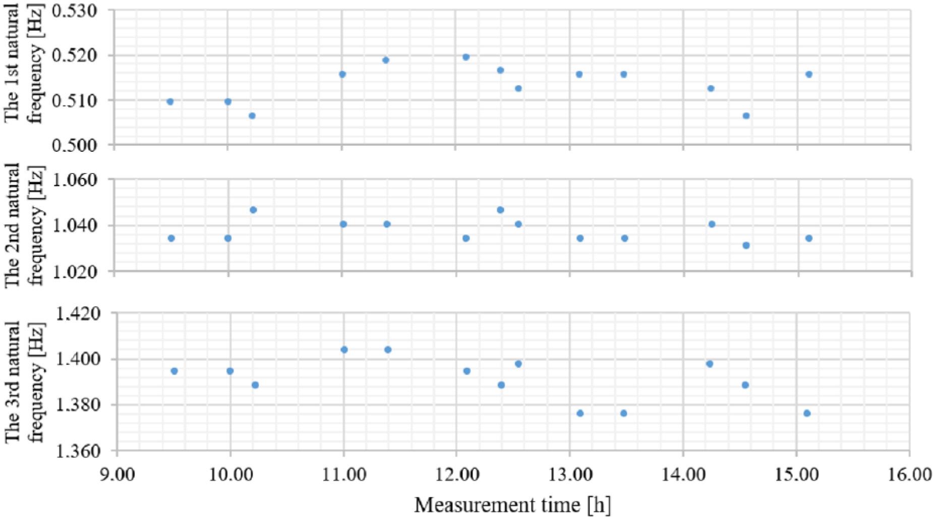 As can be seen, the vibration frequency characteristics have very similar patterns with resonance peaks corresponding to the natural frequencies of the bridge-vehicle system in the range of up to about 6 Hz. On the other hand, the vibration frequencies in the range of about 8 to 16 Hz change slightly. This range corresponds to the frequencies of the vibration excitation source caused by passing vehicles [9]. Hence, it can be concluded that during the 10-min measurement period, the vehicle traffic showed slightly variable dynamic excitation energy, and the frequency characteristics of the bridge showed repeatability.