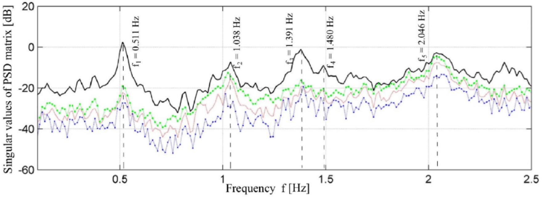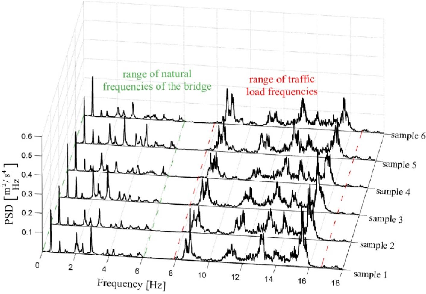 Figure 7 presents the Power Spectral Density (PSD) function of the bridge vibration accelerations, recorded in the vertical direction at the reference point due to daily road traffic flow in 10-min intervals at different times.