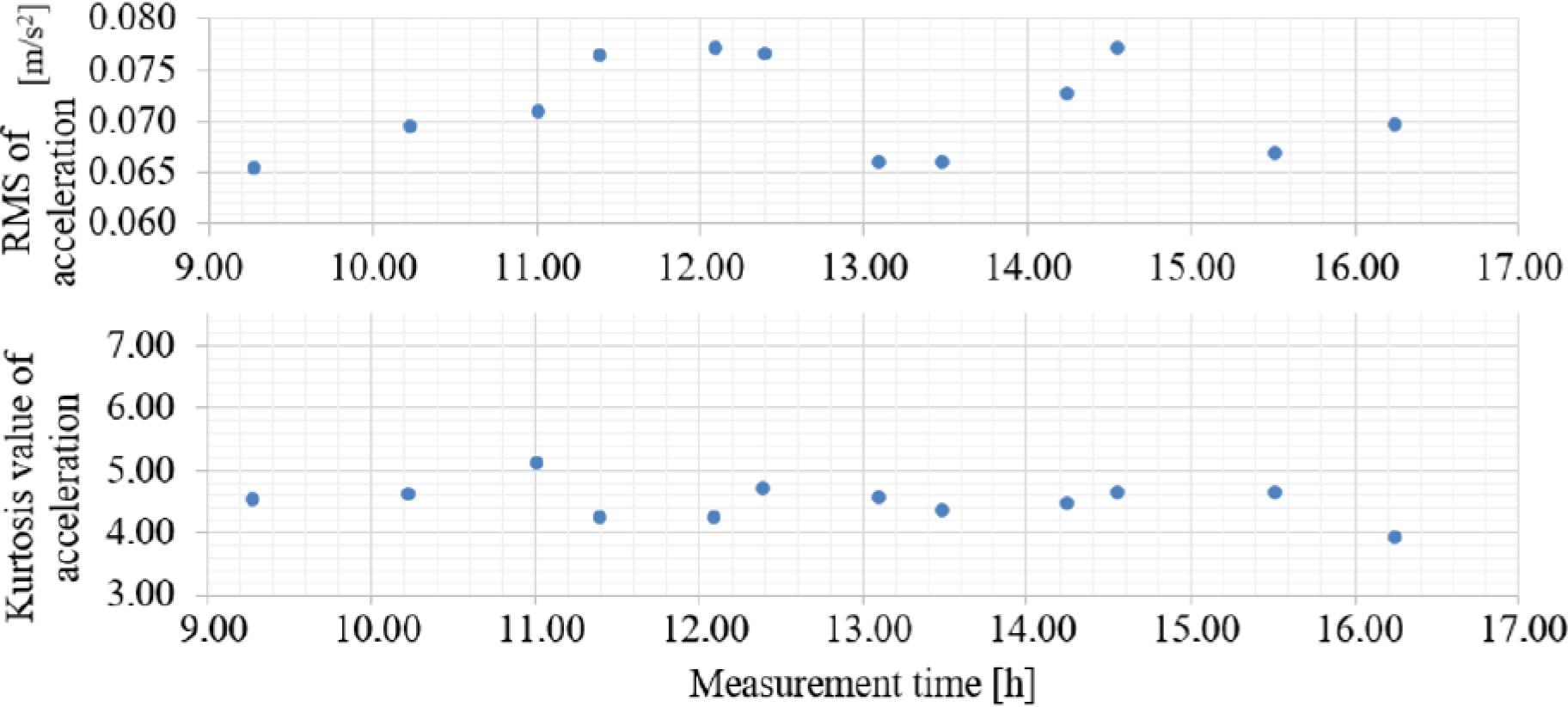 If, due to the non-stationary nature of the analyzed signal representing the dynamic response of the structure, this signal contains peak values of vibration amplitudes significantly deviating from the mean value, the kurtosis value increases quickly with the increasing number of these peak values and their more significant deviation from the mean value. According to the experience of other researchers in [19,20], the kurtosis value exceeding the number of 10 classifies the analyzed stochastic process as non-stationary. Below this value, the process can be treated as a process with features similar to a stationary process. The kurtosis of a random signal, defined in equation (1), which characterizes the probability density function with a Gaussian distribution, is equal to 3.