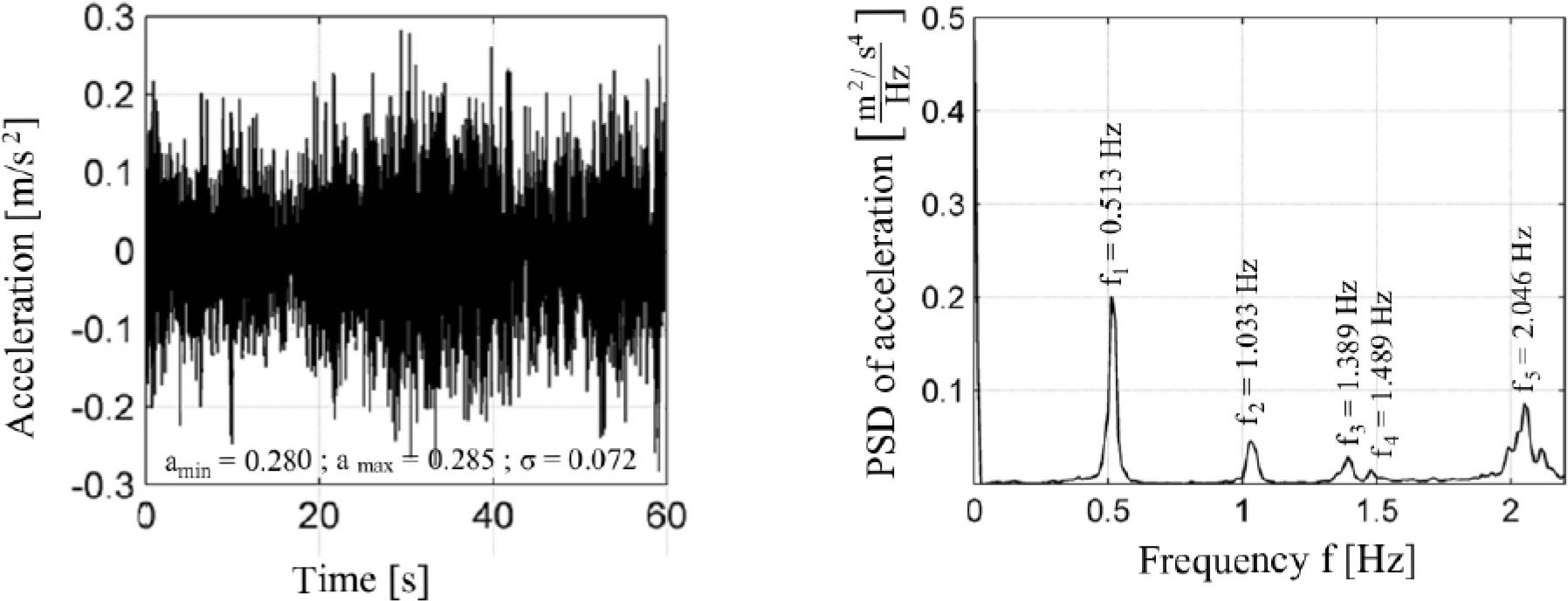 During the experimental measurements, the bridge vibrations were excited by continuous random vehicle traffic flow. At each measuring point of the bridge spans, vibration accelerations were recorded with a sampling frequency of 200 Hz during a measurement period ongoing at least 10 min.