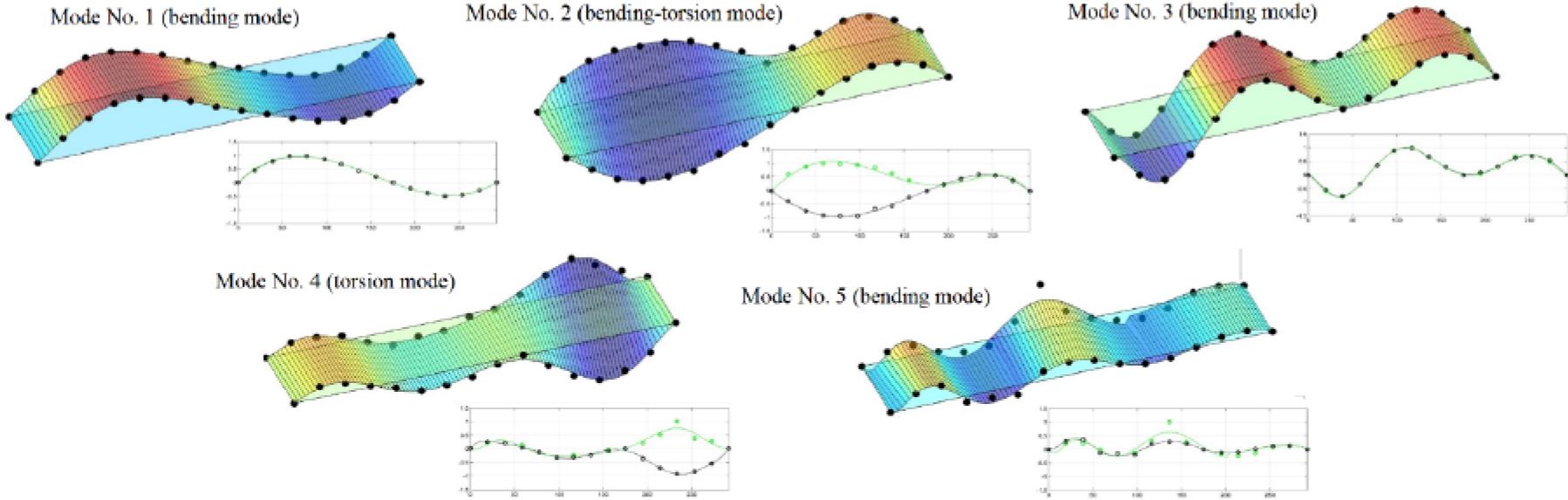 The obtained results are closely similar to those obtained using the PP method, which indicates the good accuracy of the FDD method in determining bridge vibration frequencies. Each sequent natural frequency corresponds to the next natural vibration mode shape. Figure 11 shows five normalized natural vibration mode shapes in the vertical direction of the deck slab of the bridge-vehicle system. Modes No. 1, 3, and 5 were related to the bending type of mode. Mode No. 4 resulted from the bridge span torsional movement, while mode No. 2 was the effect of the bending-torsional movement.
