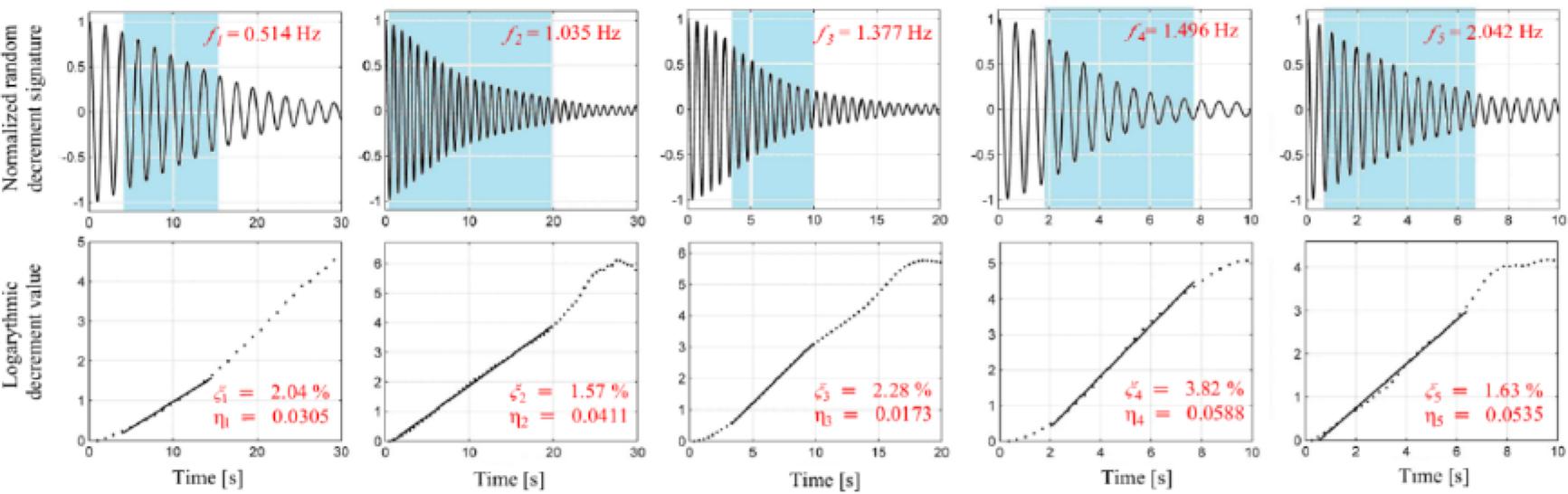 Based on the authors' experience, e.g. [31] and [32], it can be stated that the RDM technique is more accurate than the EFDD method in determining the structural damping ratios because the measurement signal is analyzed in the time domain based on a relatively simple calculation algorithm. In turn, the EFDD method is a frequency domain technique and requires spectral transformations of the recorded time history of the structural response. This is associated with certain uncertainties depending on, among others, the frequency resolution of the spectral functions and the possibility of the adverse effect of the spectral leakage phenomenon on the obtained results. Therefore, in this study, the damping ratios were determined exclusively by the RDM method.