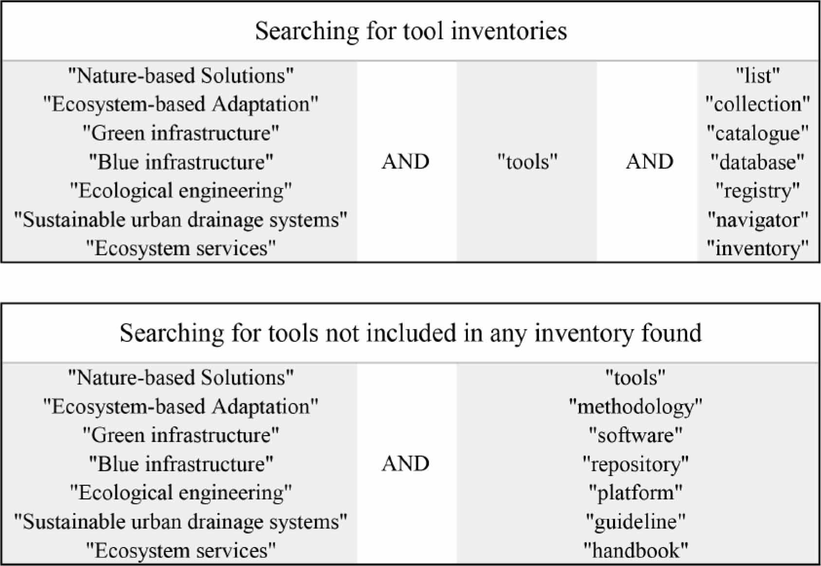 Search for tool inventories supporting the implementation of Nature-based Solutions tools not included in any inventory found;