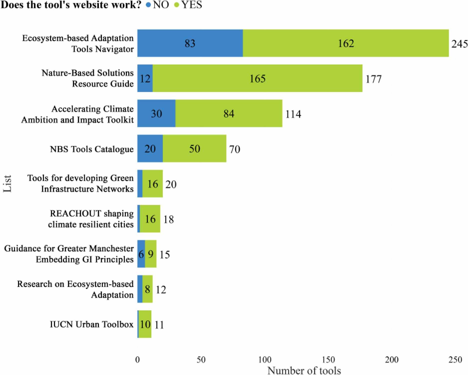 The inventories that contained the highest number of resources encompassing websites with expired URL links were Ecosystem-based Adaptation Tools Navigator (83), Accelerating Climate Ambition and Impact (30), and NbS Tools Catalogue (20) (Figure 3). This is because these are the inventories containing the most tools, so they were most likely to contain websites with expired URL links. Upon tracing the source sites, we found that only the 2021 NbS Tools Catalogue stood out among the others for the percentage of non-functioning content – 11 tools among the 70 in the inventory (Figure 4).
