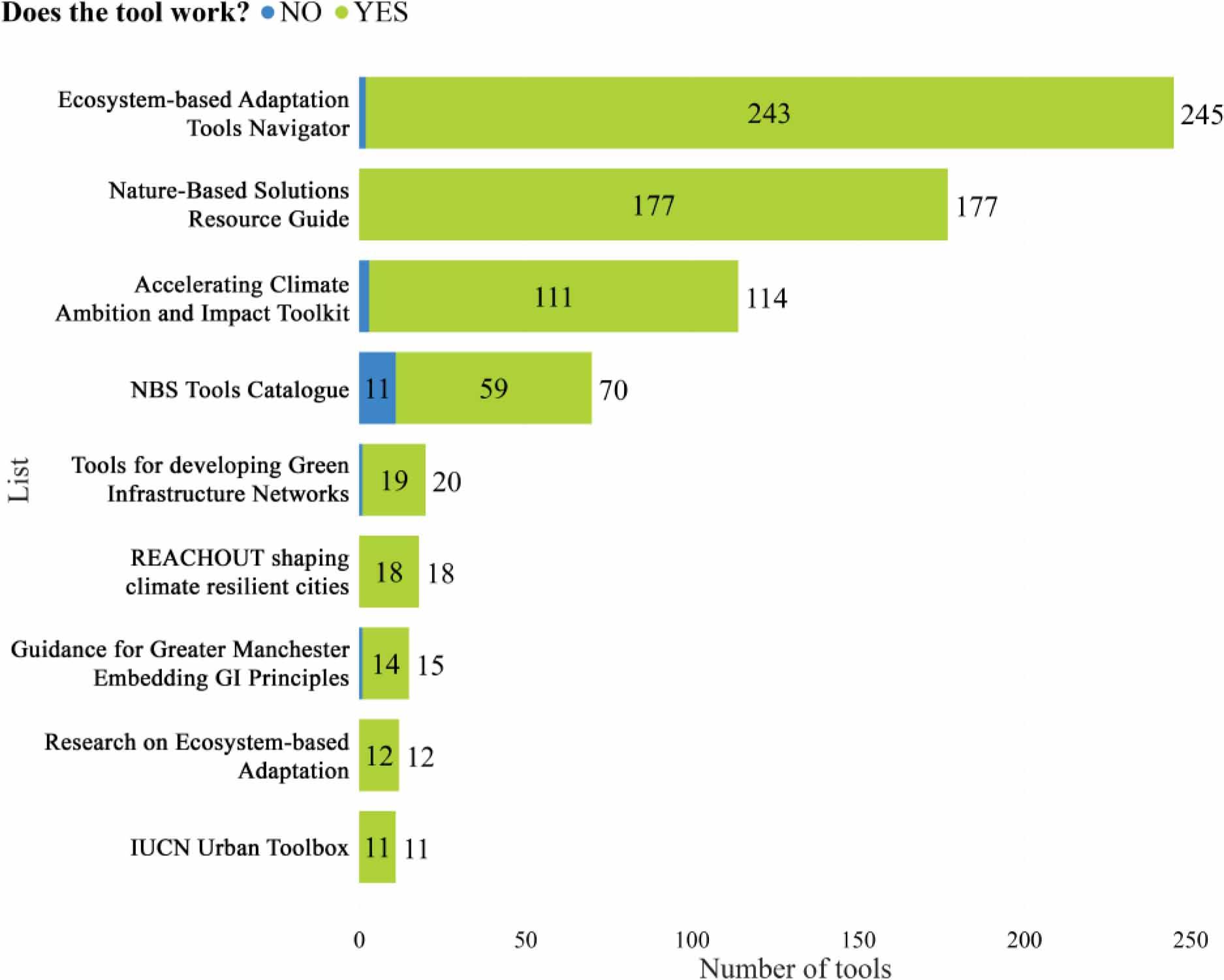 We also applied a critical analysis, which indicated that the large amount of NbS information available and the lack of a single, consistent database can lead to user confusion and, in the worst case, to the selection of an inappropriate tool. The findings suggest that text documents, data sheets and off-the-shelf software provide a more durable medium for information than websites or databases requiring dedicated servers, which can prolong the life of a tool. We also highlighted the language barrier - although English is universal, using it as the sole language of the tools can make them difficult to use for users who are not fluent in specialist terminology.
