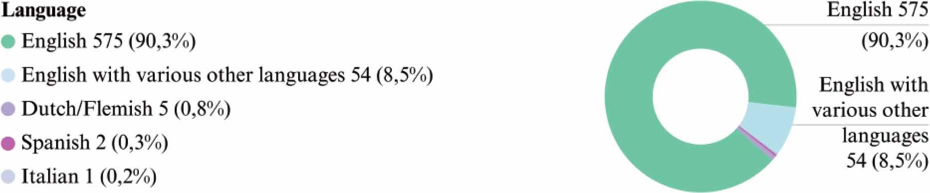 Almost all tools (629 tools – 98.7%) functioned in English, of which 575 (90.3%) were only available in English (Figure 6). 54 tools were in different languages, i.e. English together with others (8.5%), of which the largest number of tools were available in 3 language versions: English, French and Spanish (14 tools - 2.2%). Only 8 tools (1.3%) were exclusively in languages other than English: 5 in Dutch, 2 in Spanish and 1 in Italian.