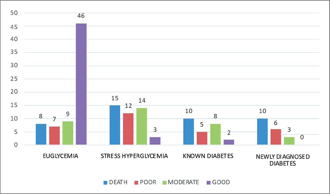 44.3% cases were euglycemic, 27.8% cases were stress hyperglycemic, 15.9% cases were known diabetic, and 12% cases were newly diagnosed diabetics.