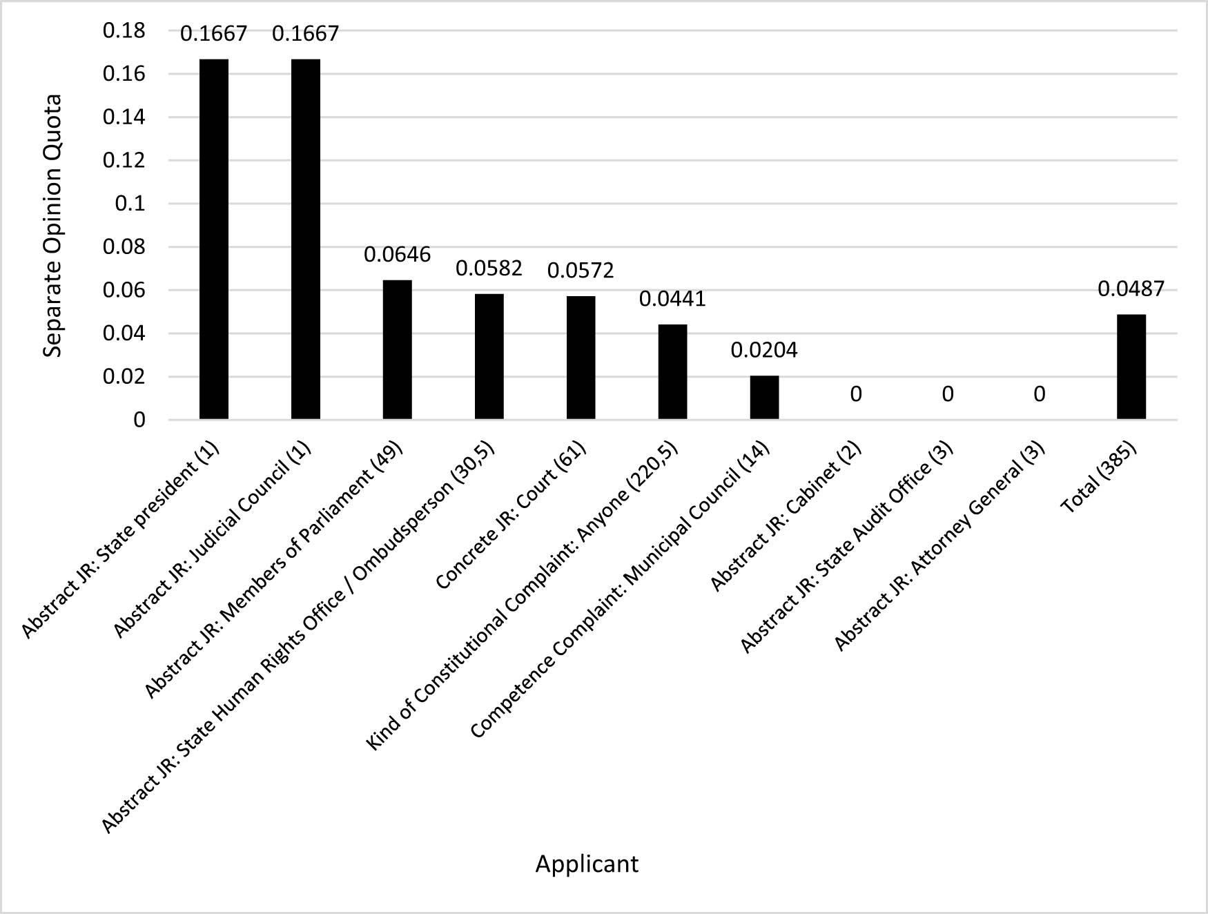 Cases initiated by applicants with broad access to judicial proceedings lead to a higher separate opinion quota in the judgments of the constitutional judiciaries.