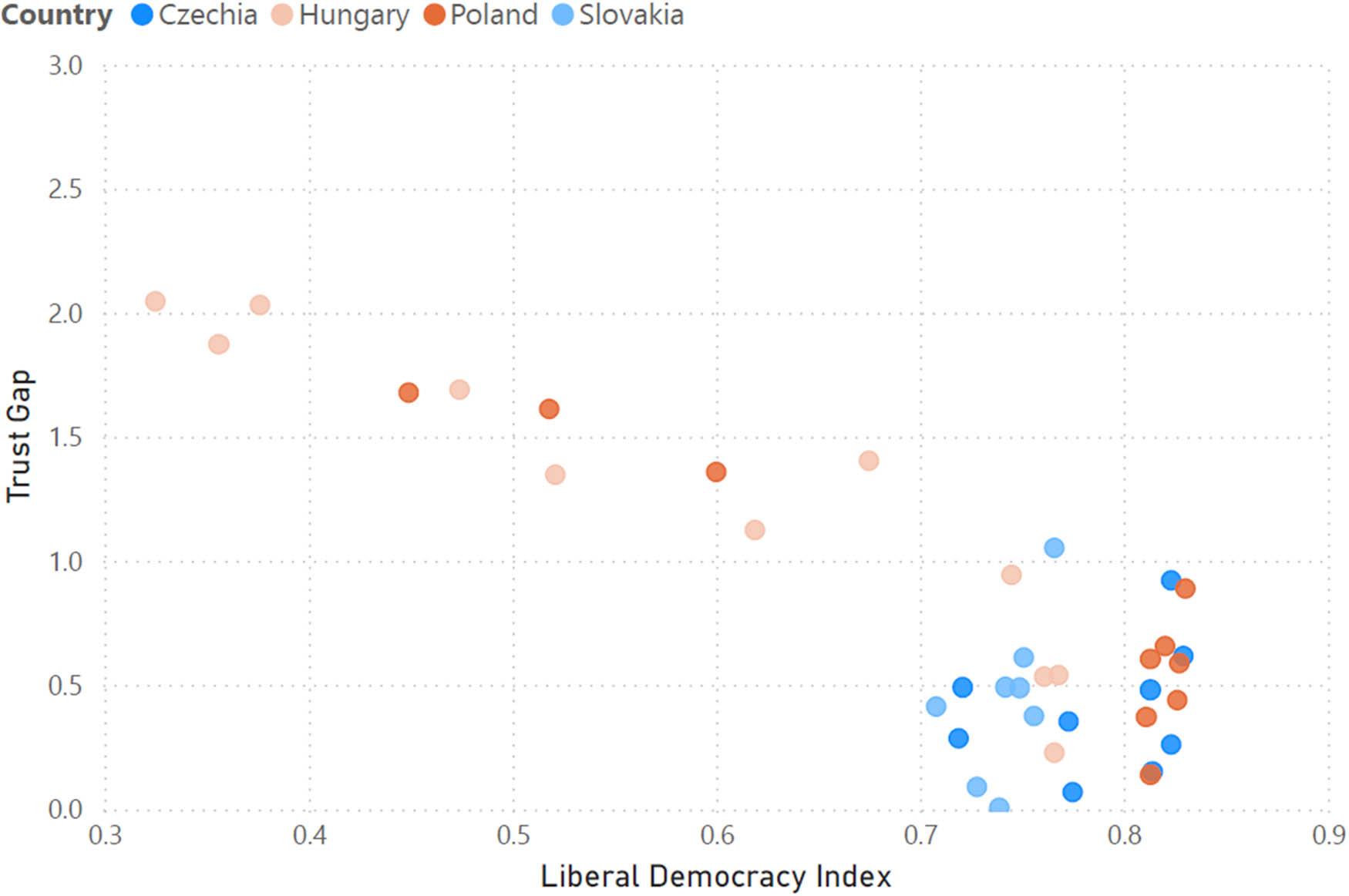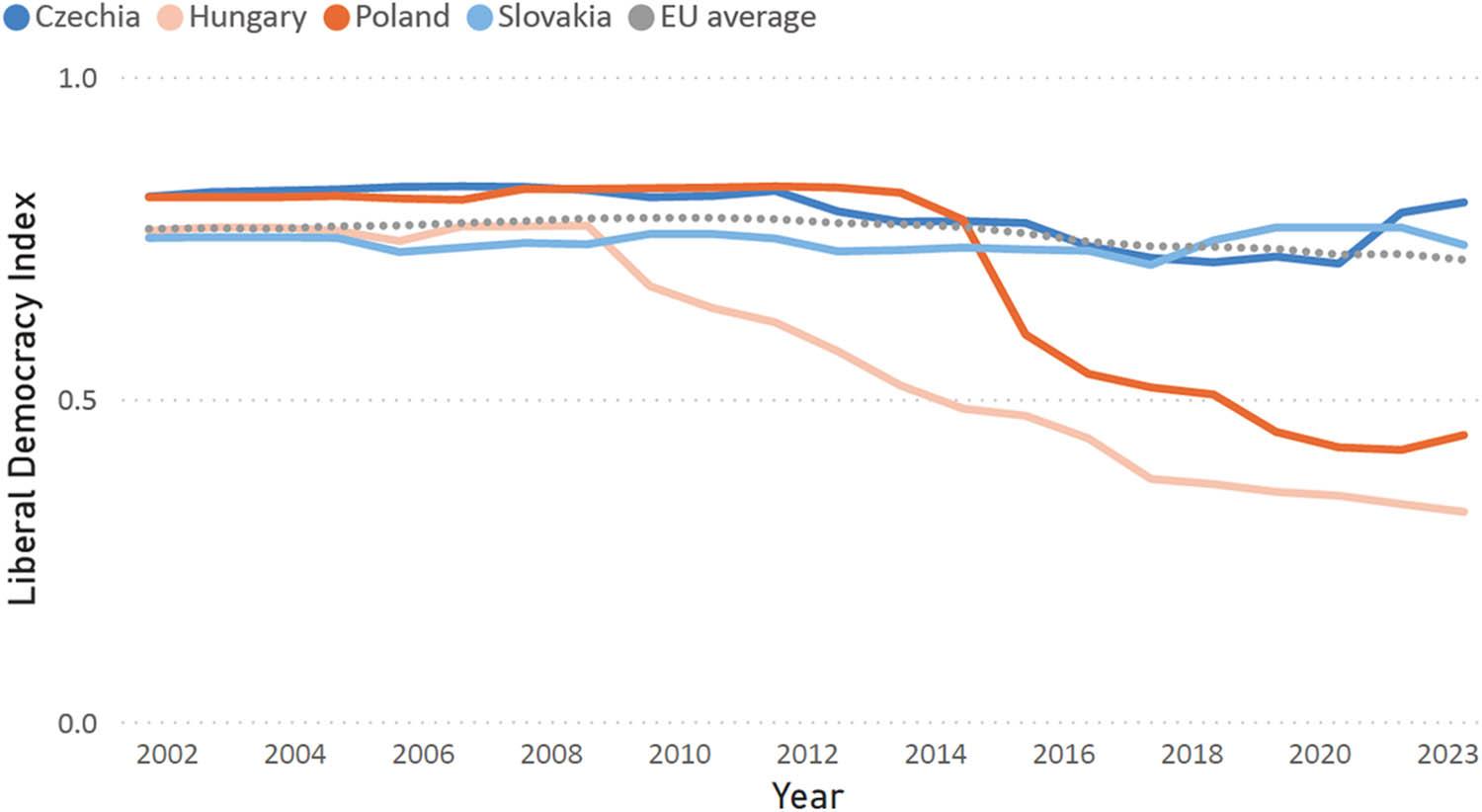 | Dimitrova (2018) | Democratic backsliding leads to social polarization as various groups respond differently to these changes | Central and Eastern Europe |