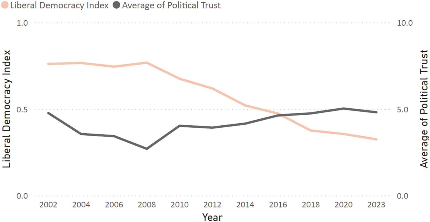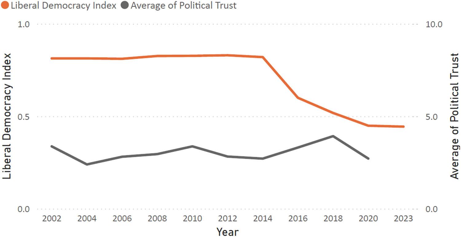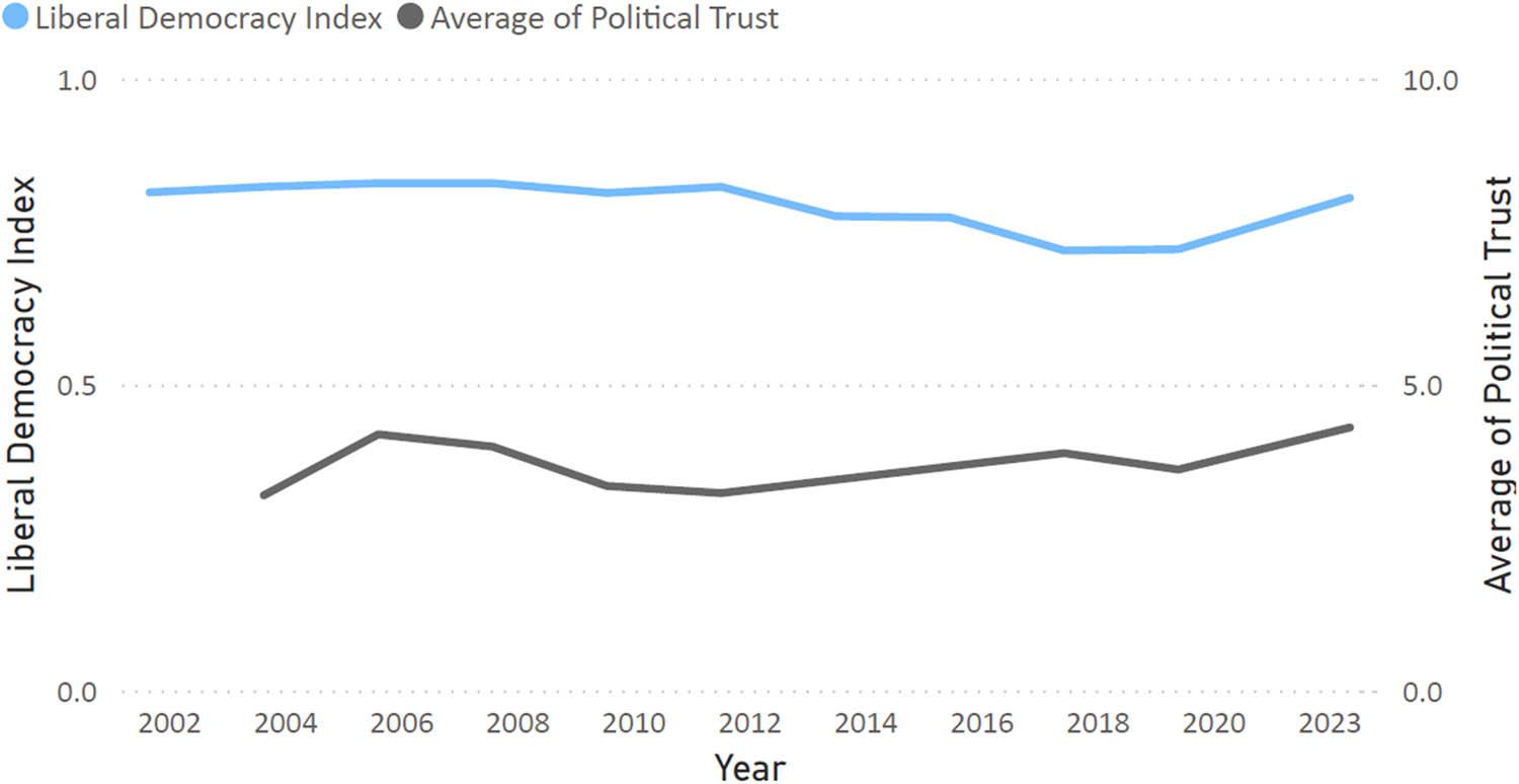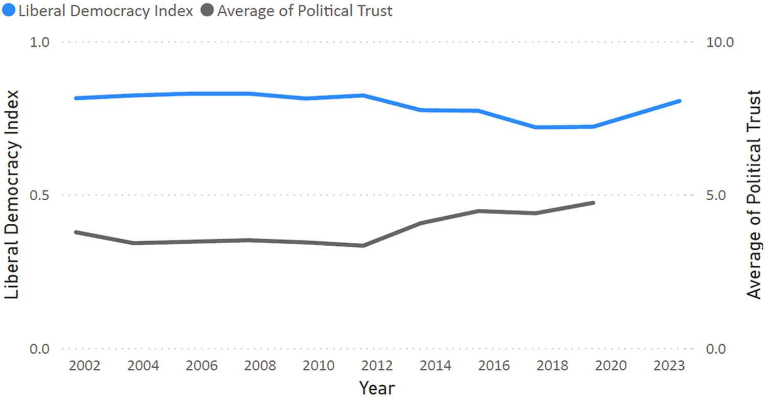 | High political trust | High risk of democratic erosion | Healthy democracy with mutual confidence | |