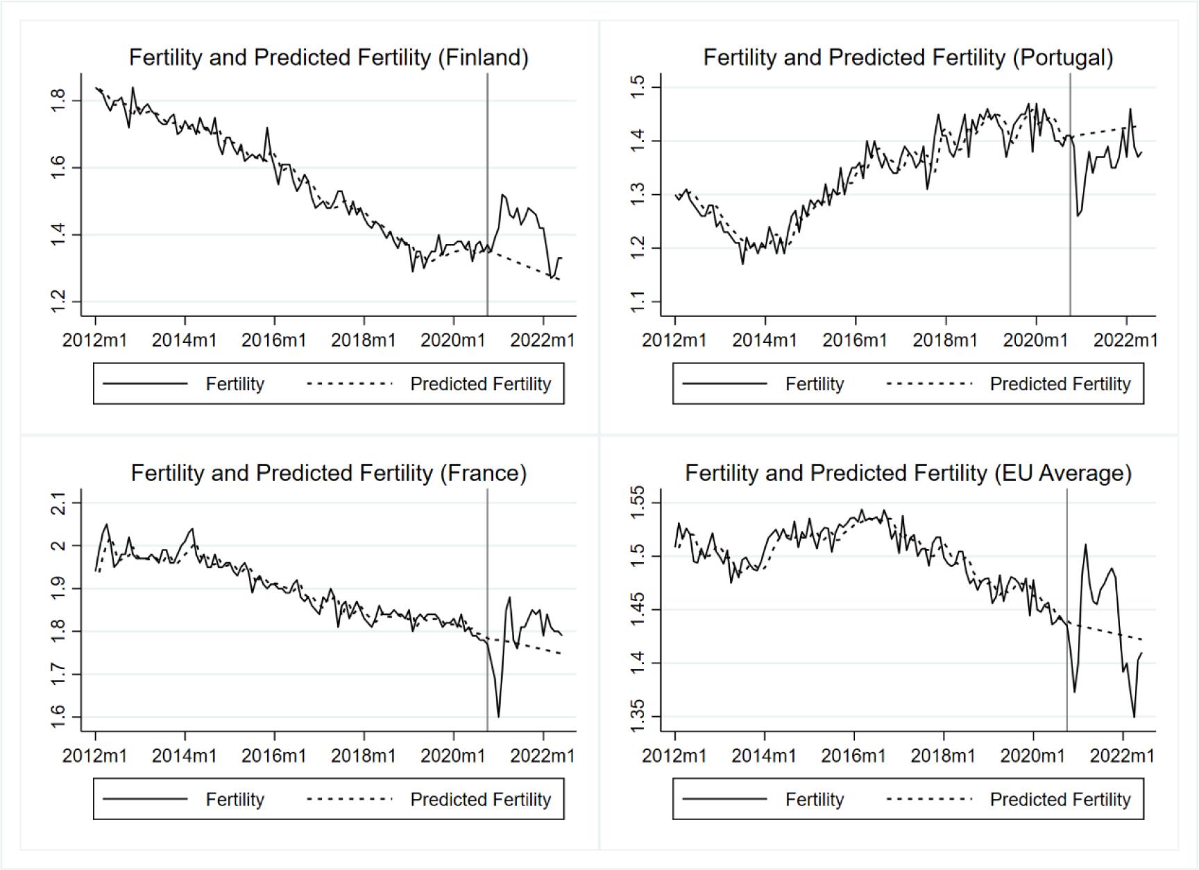 In contrast, the fertility rate in Portugal was significantly lower than the predicted rate based on pre-pandemic data, reflecting a marked negative impact of the pandemic. This drop took Portugal’s fertility rate to a level far below the typical trajectory, suggesting that the pandemic-induced uncertainties, including economic disruption and social isolation, may have led to a postponement or reduction in family formation. Interestingly, despite the initial downturn, Portugal’s fertility rate gradually approached the predicted level over time, indicating a potential rebound as the country adjusted to the new normal, albeit at a slower pace compared to other regions. This delayed recovery suggests that the pandemic’s effects on fertility in Portugal were more persistent, possibly due to the country’s more limited social welfare provisions compared to other EU nations.
