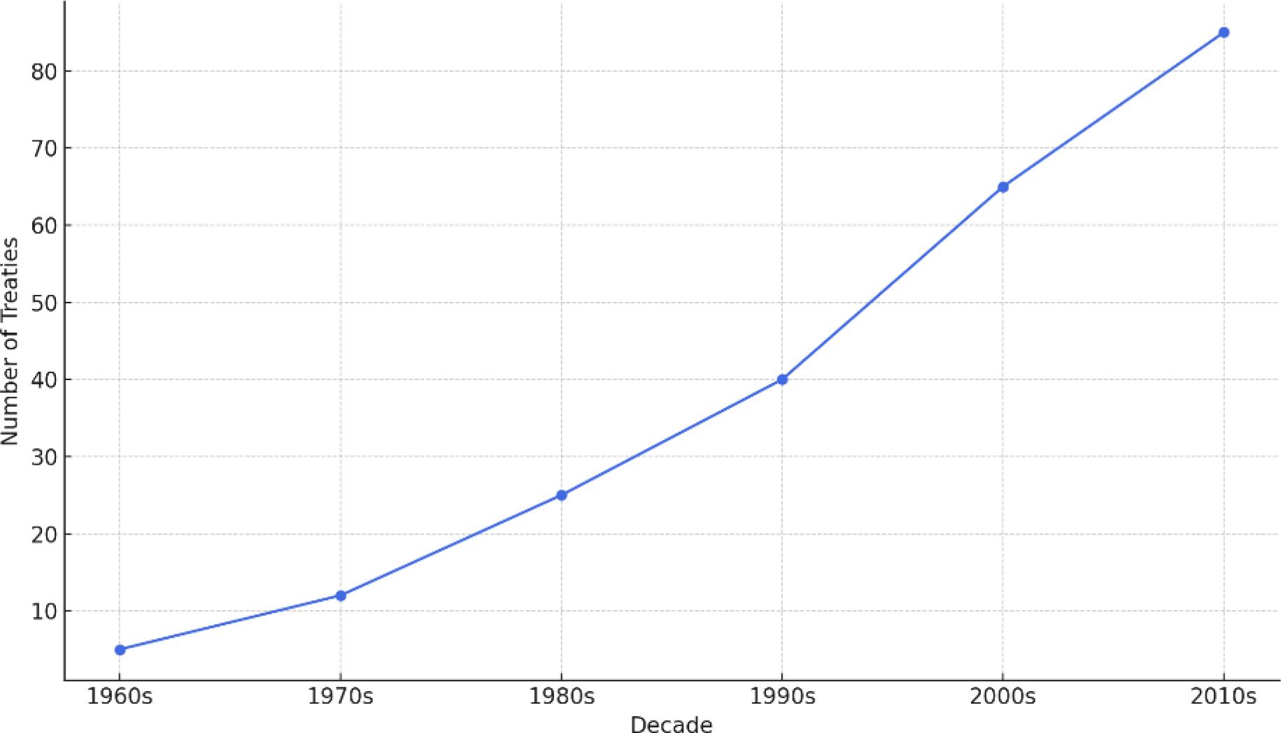 The number of international treaties influenced by European Union (EU) law has shown a consistent upward trend from the 1960s to the 2010s. Starting from just 5 treaties in the 1960s, the number rose to 85 by the 2010s. This trend demonstrates the expanding normative power of the EU in shaping international legal standards, particularly in areas such as trade, environmental protection, and human rights.