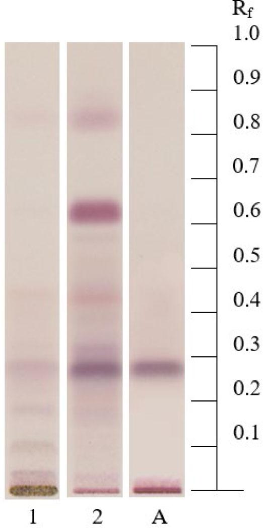 HPTLC chromatograms of the OATEs (1), Ocimum americanum essential oil (2), and linalool standard (A) after the derivatization with anisaldehyde solution at day light. Mobile phase: ethyl acetate – toluene (5:95).