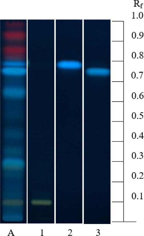 HPTLC chromatograms of the OATEs (A) and polyphenols standards (1 – rutin; 2 – caffeic acid; 3 – RA) after the derivatization with 1% methanolic AlCl3 at λ=366 nm. Mobile phase: ethyl acetate – formic acid – water (15:1:1).