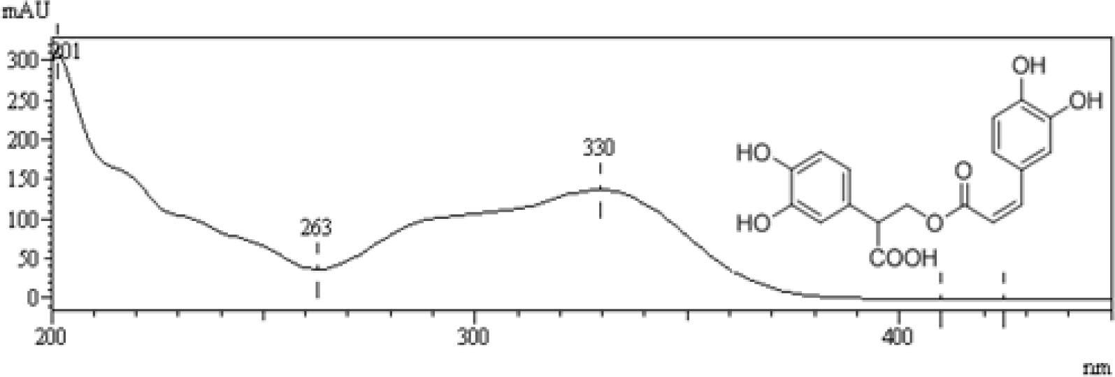 Results of HPLC analysis: 0.26 ± 0.01% of RA. Identification of RA achieved by comparison of the retention time on the chromatogram and the absorption spectra obtained for its peak in tincture with those obtained for the standard. The quantification of RA made by measuring its peak area at λ = 330 nm. The content of RA in tincture should be at minimum 0.2%.