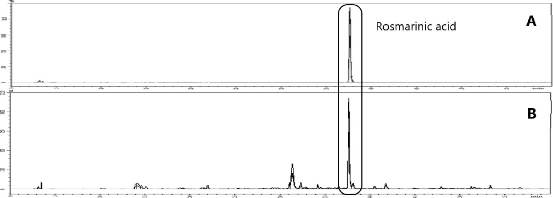 The validation of the HPLC test procedure for the analysis of RA content in the OATEs included specificity, linearity, accuracy, precision, and robustness studies. The specificity of the test was confirmed by the coincidence of retention time of the RA peak on the chromatogram of OATEs test solution with the retention of this peak on the chromatogram of RA standard solution (Fig. 3, 4). The chosen chromatographic conditions allowed to separate the peak of the RA from the peaks of other phenolic components. The values for the system suitability were an average of 6 replicates (Table 5). The linearity, recovery, accuracy, and range of HPLC method were defined on model mixtures with known content of active ingredients in the range of 80% to 120% of the RA nominal value (Table 6). The regression equation was calculated from the calibration curve for nine concentrations of the RA reference standard. The LOD and LOQ calculated for signal to noise ratio of 3 and 10, respectively. The aliquots of OATEs test solution was split and stored at 4ºC. The aliquots were compared against the fresh-prepared reference standards at various intervals to determine the standard stability. It was recommended to perform all the experiments during a maximum of 3 days and to store stock and standard solutions in a refrigerator.