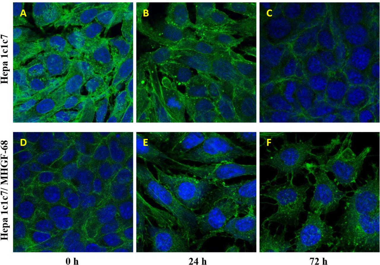 Hepa1c1c7 cells were incubated with MHGF-68. After 0, 24 and 72 h, the cells were fixed and labeled with Alexa Fluor 555 phalloidin. Nuclei were stained with DAPI. The intracelular distribution of actin filamets (green) and nuclei (blue) were imaged by confocal laser scanning fluorescence microscopy (Leica TCS SP8 AOBS) with HC PL APO CS2 63×/1.40 OIL lens.