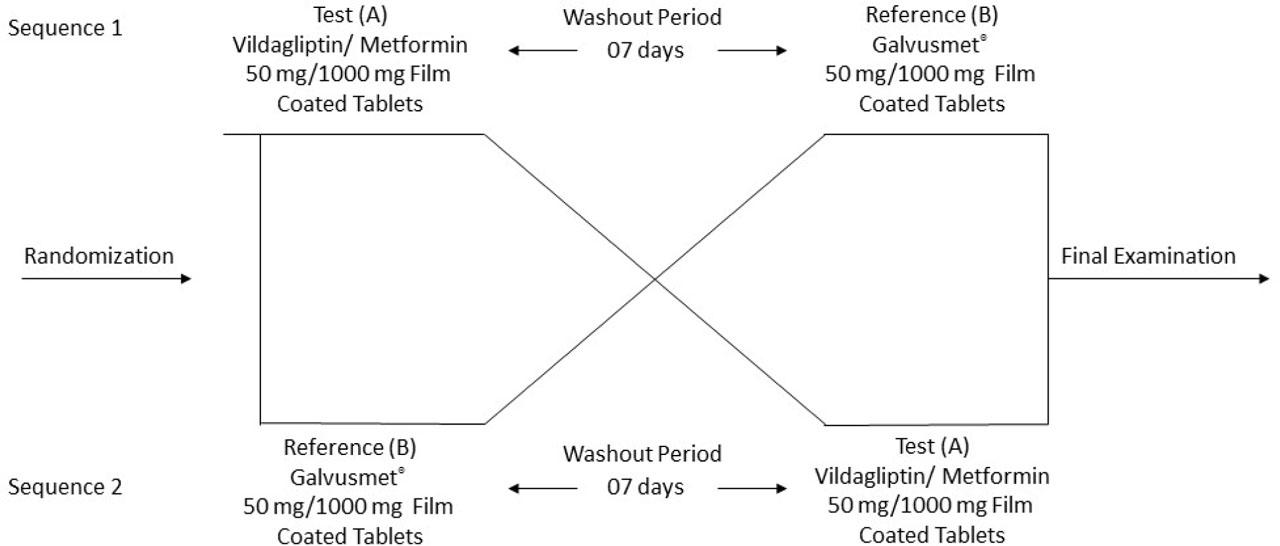 The registration trial number is ISRCTN18152519. The study was conducted according to GCP, GLP guidelines, as well as JFDA clinical studies Law no. 02 for the year 2011. Dosing was determined according to a predefined randomisation plan prepared as per Triumpharma SOP no.: PHU-1104. Subjects were randomised to receive a single dose of Sensityn® in one period and Galvusmet® in the other period. A washout period of 7 days separated the two doses. In sequence 1, subjects received Sensityn® or Galvusmet® followed by 7 days of washout period. In sequence 2, subjects were crossed over to either Galvusmet® or Sensityn®, depending on what they received in sequence 1.