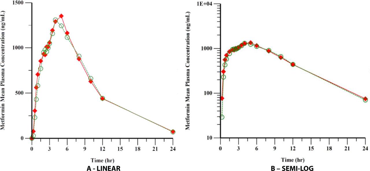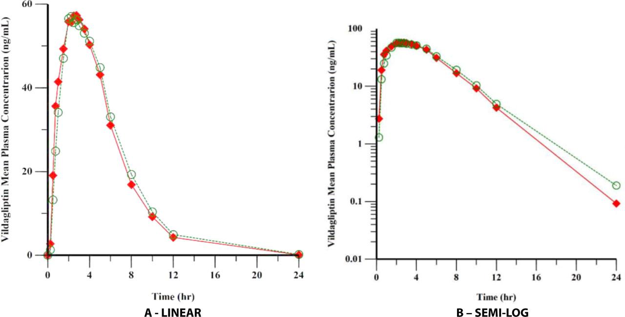 A display of the mean plasma concentrations of vildagliptin and metformin after administration of Sensityn® and Galvusmet® in healthy adult subjects using a linear and semilog scales is presented in Figures 2 and 3, respectively.