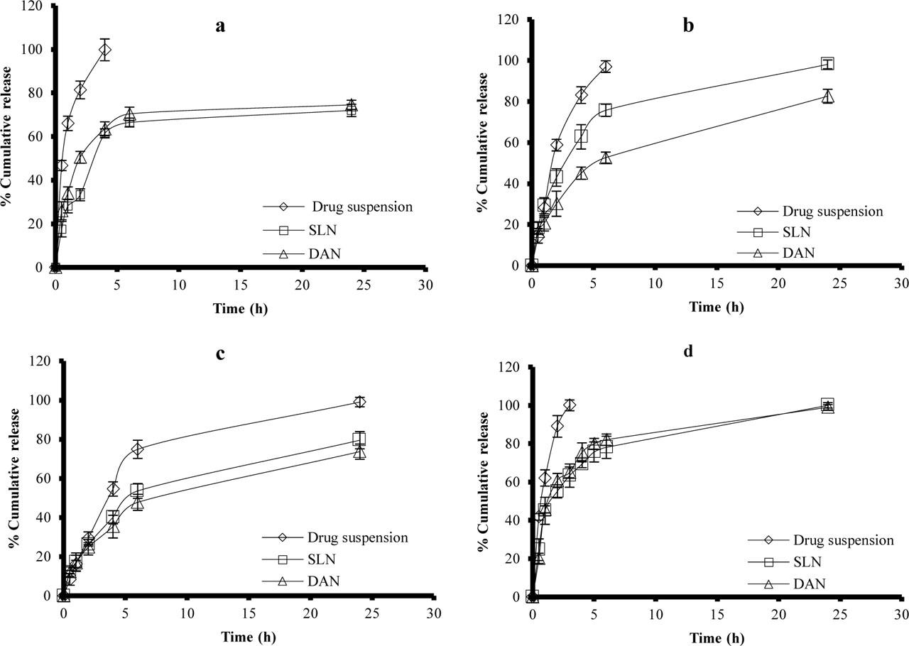 The in-vitro drug release data obtained for DANs was fitted into various kinetic models viz., zero order, first order and Higuchi to know the pattern of drug release. Table 11 shows the linearity and diffusion exponent from the kinetic plot for all the mediums studied for in-vitro drug release. It was observed that the in-vitro release profiles of drug from the DANs could be best expressed by Higuchi model as the plots showed the highest linearity than the other plots in all the media. Hence, it confers that drug was released by diffusion from the lipid matrix. Thus, the formulation complied very well with the assumptions of the Higuchi model that are, the drug concentration in the matrix is initially much higher than the solubility of the drug; the thickness of the dosage form is much larger than the size of the drug molecules.