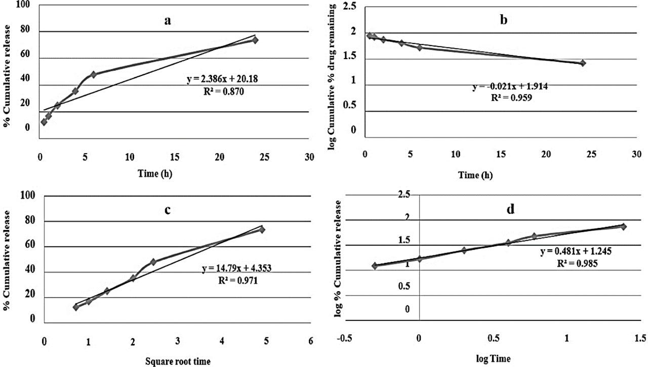 In-vitro drug release of OLZ SLNs DANs in PBS pH 7.4: (a) Zero order; (b) First order; (c) Higuchi and (d) Korsemeyer–Peppas model.