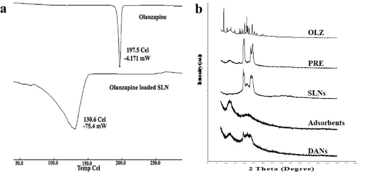 (a) DSC thermogram of OLZ and OLZ SLNs; (b) XRD spectra of the OLZ, PRE, SLNs, adsorbents and DANs. Scanning electron microscopy (SEM)