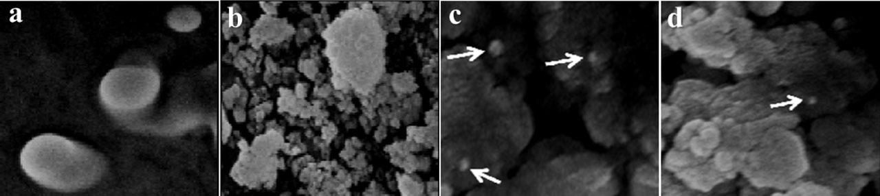 SEM of (a) OLZ SLNs; (b) adsorbents; (c) and (d) DANs of OLZ SLNs.