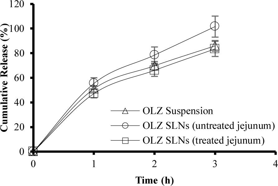 An ex-vivo intestinal permeability study through chicken intestinal (jejunum) segments with and without lymphatic blocker was carried out (Casteleyn et al., 2010). The chicken intestine was maintained with the tyrode solution. Around 10 cm long segments of jejunum (non-everted tissue) were cut and filled with OLZ suspension, and SLN. The tissue was suspended in 50 mL of PB pH 7.4 (which represents the pH of blood and also mimics the pH of lymphatic fluid) with agitation of 50 rpm maintained at 37°C. Proper aeration was supplied to the tissue, and the study was performed for a period of 3 h. Suitable aliquots were withdrawn after every interval and replaced with a pH 7.4 buffer. The aliquots were filtered through the whatman filter, diluted with methanol and analysed on UV-Visible spectrophotometer (Shimadzu 1800, Shimadzu Japan) against pH 7.4 as a blank at 258 nm.