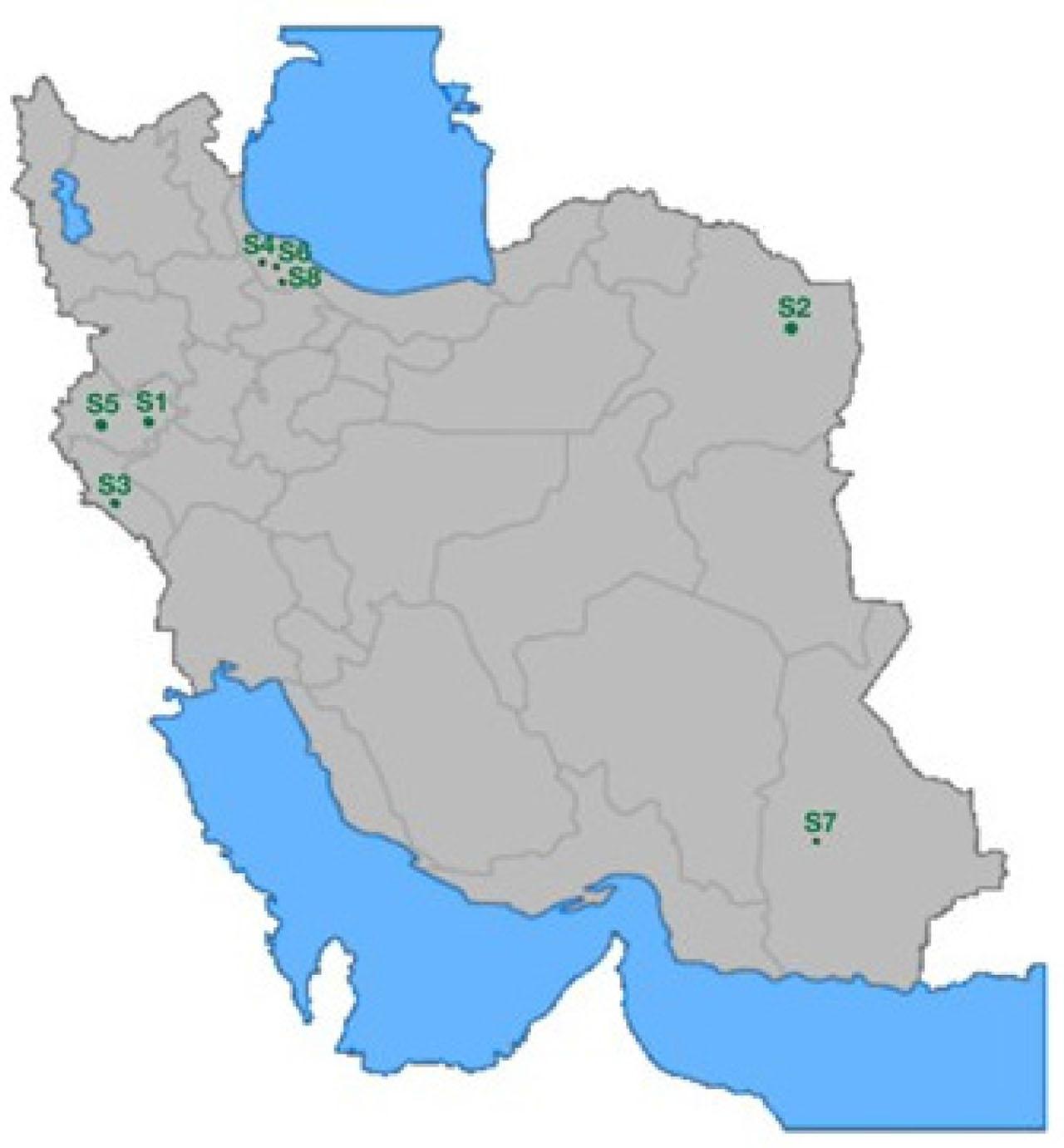 Collection sites of eight Mentha spicata samples (S1–S8) across Iran. Each point corresponds to a population used for essential oil extraction and GC-MS analysis.