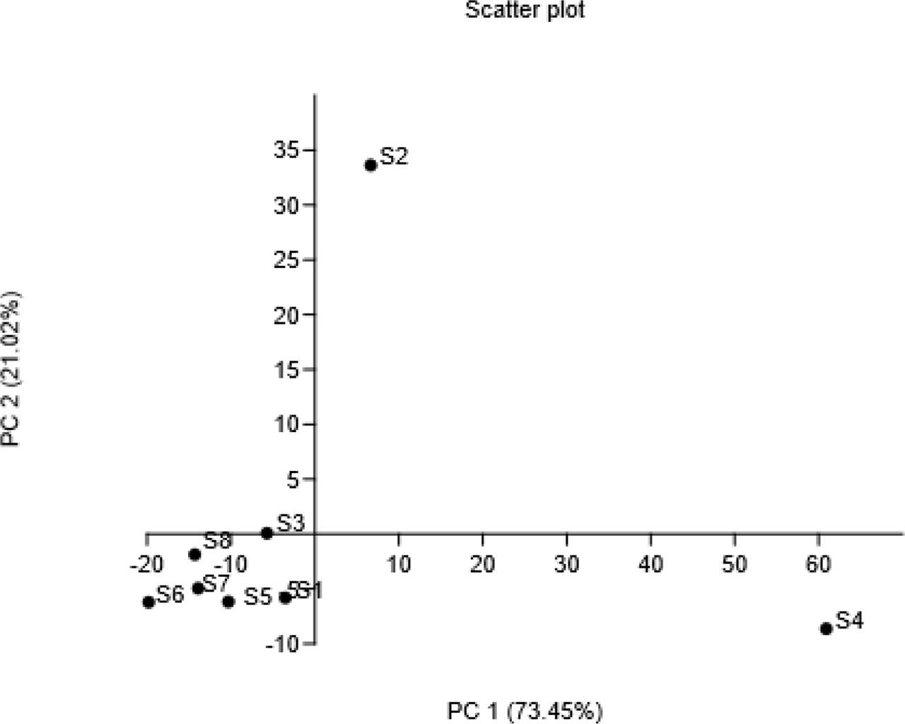 PCA of Mentha spicata essential oils collected from different regions of Iran. The scatter plot (PC 1 vs. PC 2) shows the distribution of samples based on their essential oil composition. Samples: S1 – Sonqur (Kermanshah), S2 – Mashhad, S3 – Ilam, S4 – Shaft (Gilan), S5 – Kermanshah, S6 – Sangar (Gilan), S7 – Iranshahr (Sistan and Baluchistan), S8 – Langrood (Gilan). PC 1 (73.45%) and PC 2 (21.02%) together explain 94.47% of the total variance.