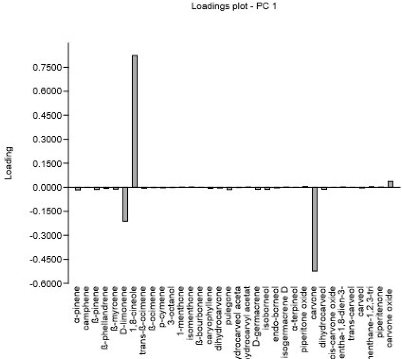 Loading plot of the first principal component (PC 1) obtained from the PCA of Mentha spicata essential oils. The plot shows the contribution of individual chemical constituents to the variability explained by PC 1 (73.45%).
