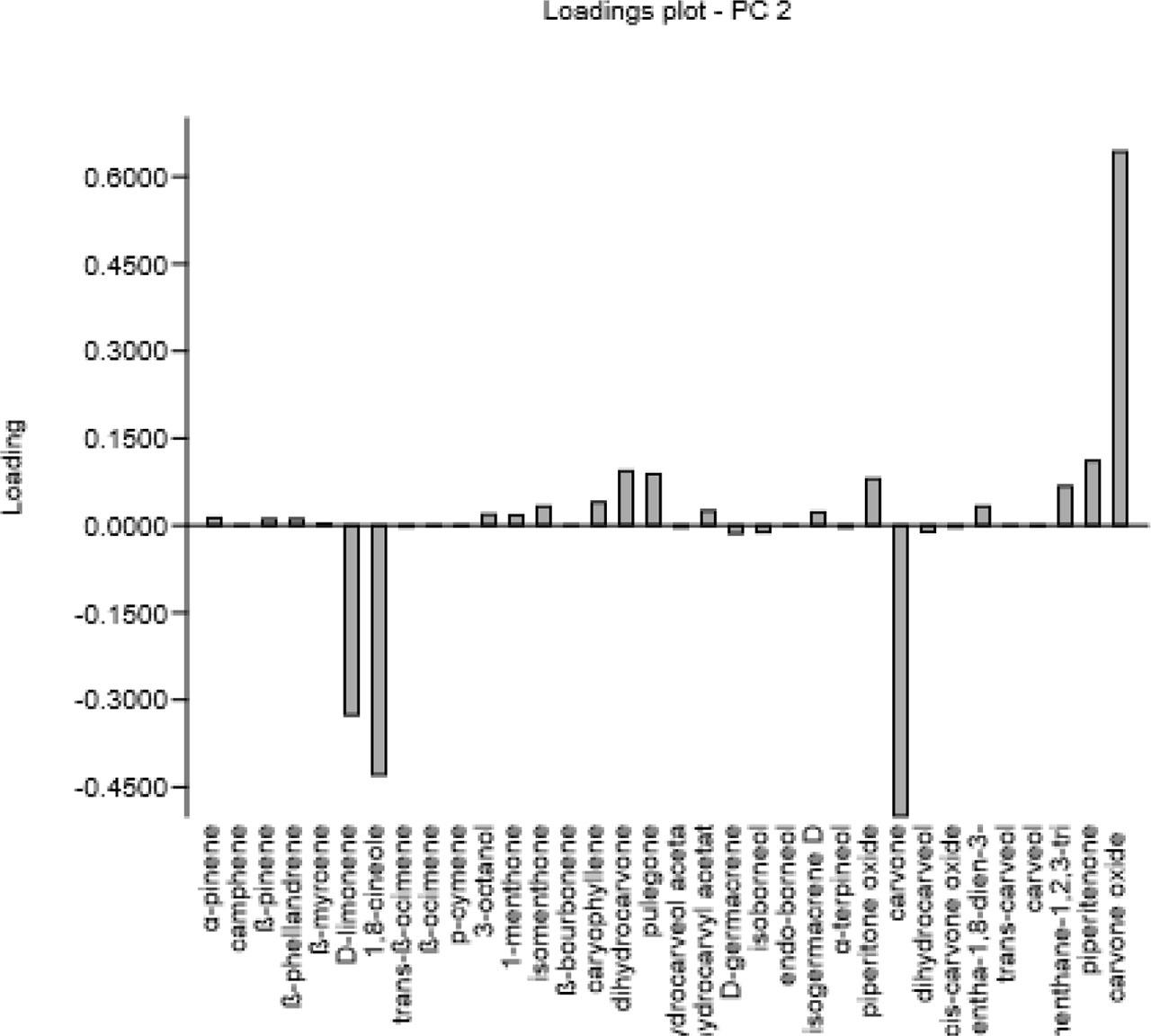Loading plot of the second principal component (PC 2) obtained from the PCA of Mentha spicata essential oils. The plot shows the contribution of individual chemical constituents to the variability explained by PC 2 (21.02%).