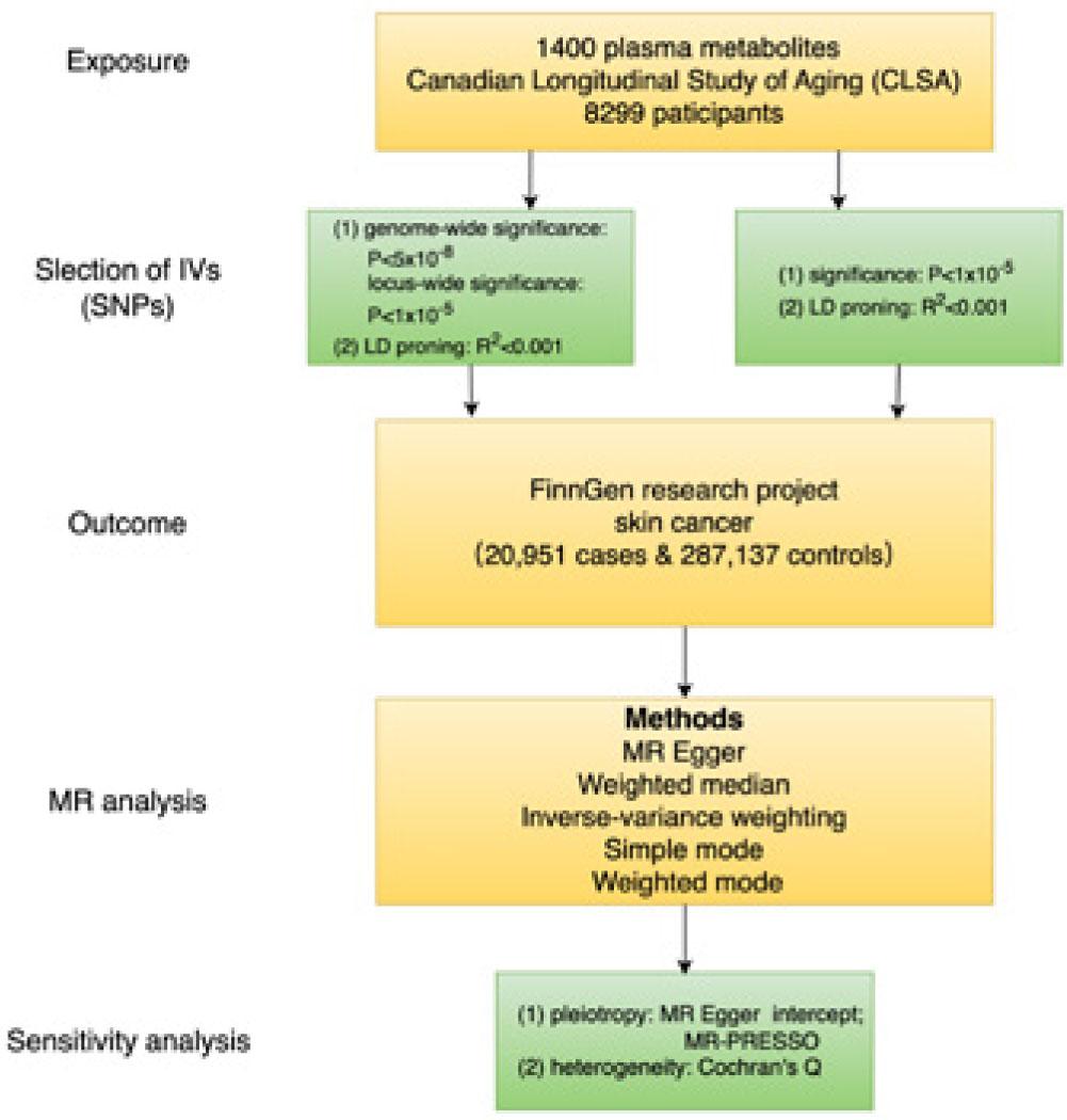 However, there is a notable gap in the literature regarding comprehensive Mendelian randomization studies that directly link plasma metabolites to skin cancer causation. This highlights the necessity for more rigorous and targeted research in this field to elucidate the potential causal pathways and contribute to the development of effective prevention and treatment strategies. The purpose of this study is to investigate the causal relationships between plasma metabolites and skin cancer risk using Mendelian randomization. By integrating metabolomic profiling with genetic data, we aim to identify specific metabolites that may contribute to skin cancer pathogenesis, thereby providing new insights into potential biomarkers and therapeutic targets for early detection and personalized treatment of this prevalent disease.