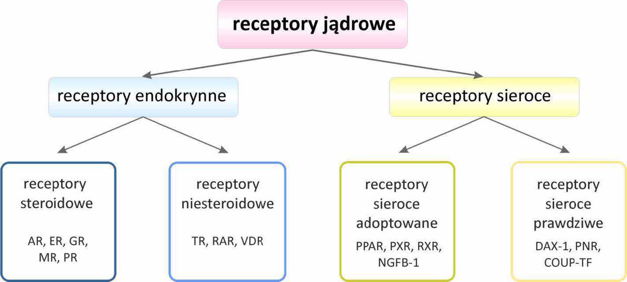 Klasyfikacja receptorów jądrowych; schemat przedstawia podział receptorów jądrowych ze względu na rodzaj wiązanego liganda. Dwie główne grupy to receptory endokrynne oraz receptory sieroce. Receptory endokrynne można podzielić na receptory steroidowe i niesteroidowe, a receptory sieroce na adoptowane i prawdziwe. W ramkach podano przykłady receptorów należących do poszczególnych grup; wg [3]