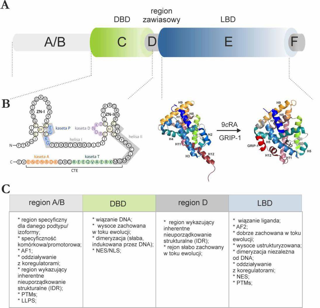 Schemat strukturalnej i funkcjonalnej organizacji RXR; A - RXR jest zbudowany z sześciu regionów oznaczonych A-F. B. Istnienie struktur wyższego rzędu oraz kryteria funkcjonalne przyczyniły się do wyróżnienia domen: domeny wiążącej DNA (DBD) i domeny wiążącej ligand (LBD). Schemat po lewej stronie przedstawia sekwencję aminokwasową DBD podtypu hRXRα, obejmującą region C oraz koniec N regionu D, tzw. C-końcowe wydłużenie (CTE). Kolorem żółtym zaznaczono reszty cysteinylowe koordynujące dwa jony cynku, a kolorem szarym reszty aminokwasowe, które wchodzą w skład dwóch α-helis. Zaznaczono również reszty obejmujące kasety P, D, T i A zaangażowane w oddziaływanie z DNA i dimeryzacje. Schemat po prawej stronie przedstawia struktury krystaliczne hRXRα LBD niezwiązanej z ligandem (PDB, 6HN6) oraz po związaniu liganda (9cRA) i koaktywatora GRIP-1 (ang. GR-interacting protein 1) (PDB, 3OAP). Obie struktury różnią się istotnie, głównie pod względem innego położenia helisy H12. C. Krótka charakterystyka funkcjonalna dla poszczególnych regionów/ domen RXR; wg [53, 54, 55, 56]