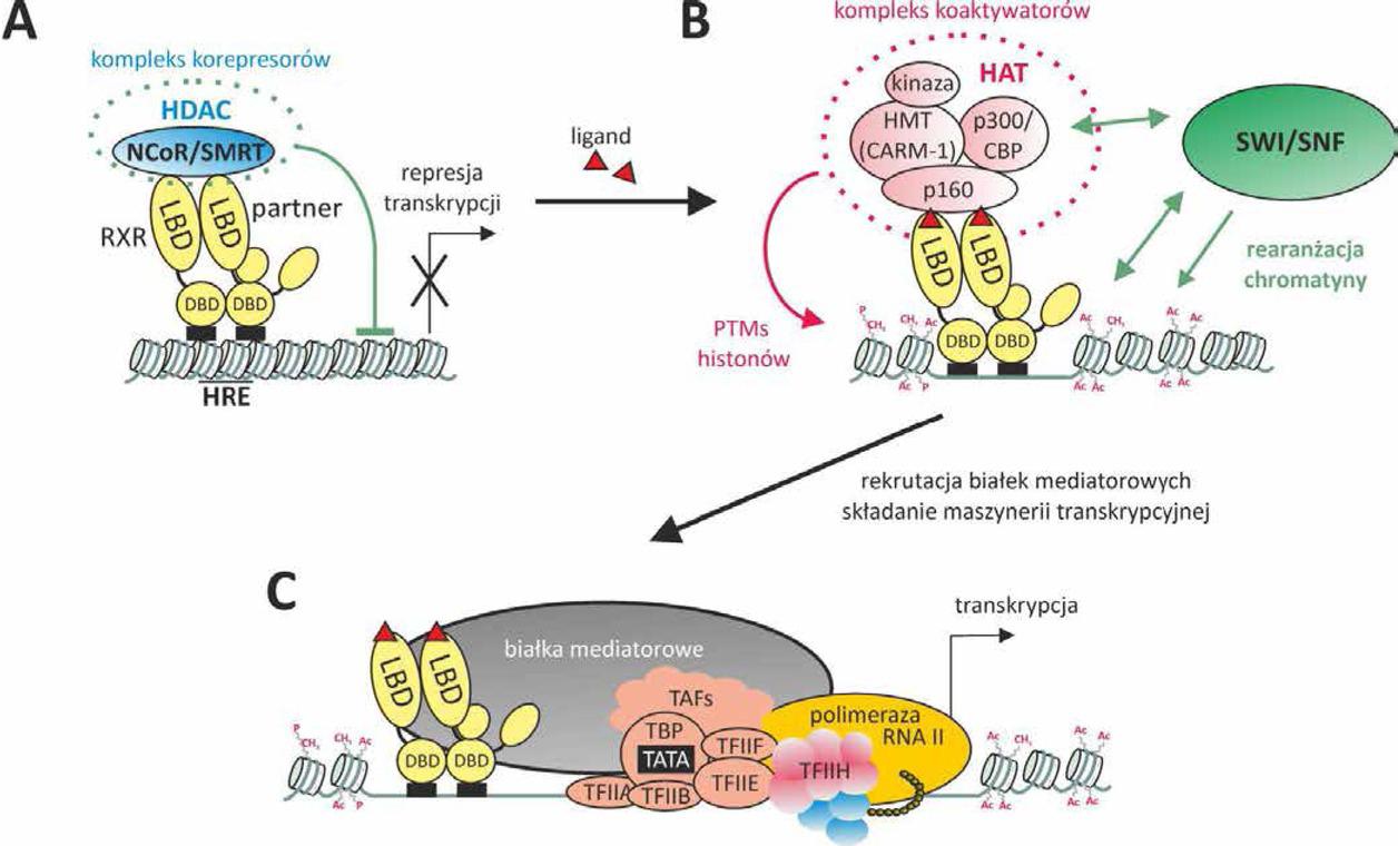 Trzyetapowy mechanizm aktywacji transkrypcji z udziałem RXR; mechanizm aktywacji transkrypcji z udziałem RXR składa się z trzech etapów: represji (A), derepresji (B) i aktywacji transkrypcji (C). Represja jest zależna od apo-RXR, który oddziałuje z kompleksem korepresorów mających aktywność HDAC. Po związaniu liganda następuje etap derepresji, polegający na oddysocjowaniu kompleksu represorów i związaniu koaktywatorów o aktywność HAT. W trzecim etapie kompleks koaktywatorów oddysocjowuje, a przyłączony zostaje kompleks białek mediatorowych. Umożliwia oddziaływanie z podstawową maszynerią transkrypcyjną i aktywację docelowych genów; wg [50, 72]