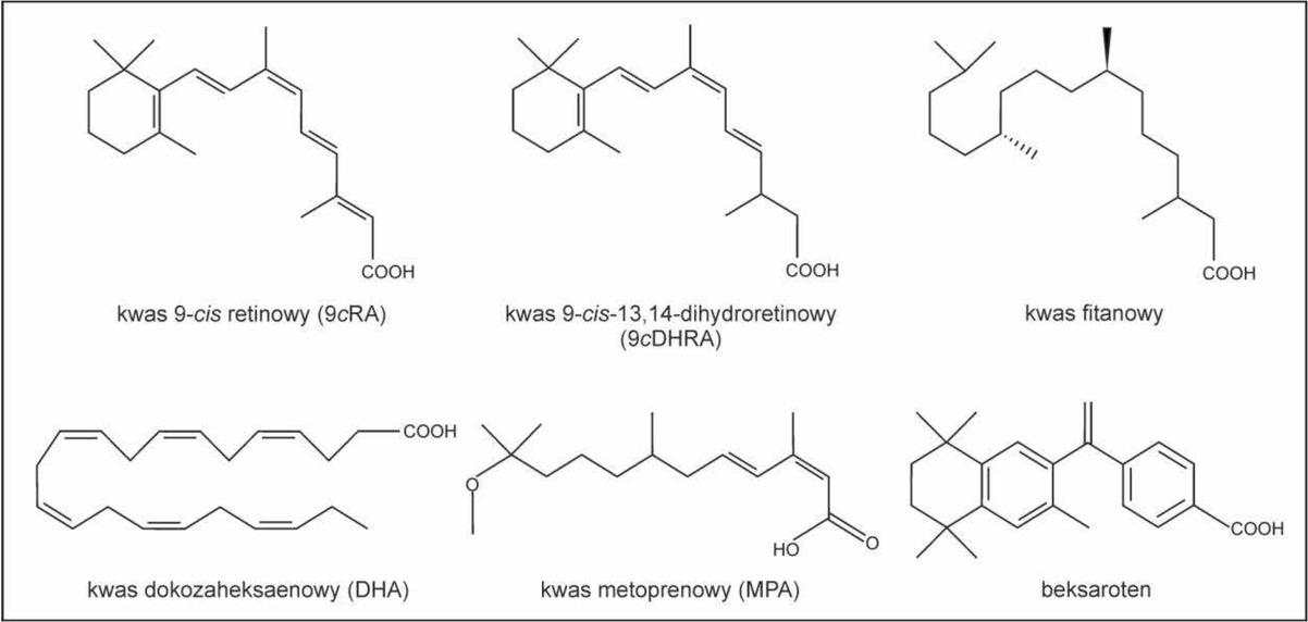 Na podstawie badań z lat dziewięćdziesiątych XX w. powszechnie przyjęto, że endogennym ligandem RXR jest kwas 9-cis-retinowy (9cRA) (ryc. 4), stąd też nazwa tego receptora. Mimo że związek ten in vitro aktywuje zarówno homodimery, jak i heterodimery RXR, to jego rola jako endogennego liganda RXR budzi wiele zastrzeżeń. Wykazano, że endogenne stężenie 9cRA jest na poziomie 0,03-0,003 nM [75]. Liczne testy oparte na aktywacji transkrypcji genu reporterowego prowadzone na różnych liniach komórkowych wykazały, że minimalne stężenie 9cRA wymagane do aktywacji transkrypcji mieści się w zakresie 10-100 nM [7]. Oznacza to, że stężenie 9cRA w tkankach jest zbyt niskie, aby związek ten skutecznie mógł wiązać się z receptorem i go aktywować. Jedyne dane wskazujące na znaczenie fizjologiczne 9cRA dotyczą badań na myszach, gdzie w trzustce tych gryzoni potwierdzono obecność 9cRA w stężeniu odpowiednim do wywołania odpowiedzi. Obecnie przyjmuje się, że tylko po suplementacji retinoidami możliwe jest uzyskanie odpowiedniego stężenia 9cRA, aby aktywować RXR. Ze względu na wpływ 9cRA na proliferację i różnicowanie komórek oraz apoptozę, związek ten był badany pod kątem wykorzystania go w chemioprewencji oraz chemioterapii. Alitretynoina (9cRA) jest stosowana miejscowo do leczenia uszkodzeń skóry u pacjentów z mięsakiem Kaposiego [76]. Jednak stosowanie alitretynoiny, jak również innych retinoidów, związane jest z licznymi działaniami niepożądanymi takimi jak: bóle głowy, hipertrójglicerydemia, hiperkalcemia czy wysypka; związki te mają silne działanie teratogenne. 9cRA mimo wielu zastrzeżeń związanych z brakiem znaczenia fizjologicznego, stał się wyjściowym elementem do projektowania nowych związków mogących selektywnie aktywować RXR i mieć znaczenie terapeutyczne [62].