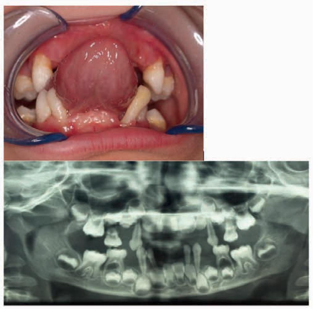 A 4-year-old patient. Premature loss of incisors and first maxillary and mandibular molars, generalised decrease in the translucency of the alveolar maxillary and mandibular bone with pronounced bone atrophy in the region of right mandibular cuspid and second mandibular molars, as well as root resorption of second mandibular molars
