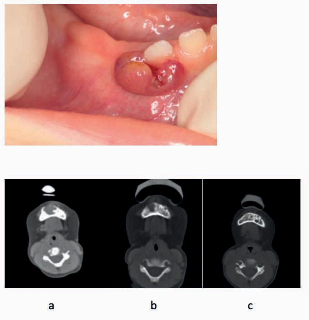 A 10-month-year-old patient. Alveolar mandible expansion in the region of teeth 81-83 in the single-system LCH. Image of oral cavity lesions on computed tomography before treatment (a), 6 months after the start of treatment (b) and after completion of the therapy (c)