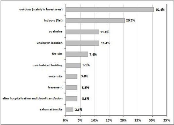 | Variable | 1 Indoors (flat/after hospitalization) n = 19 | 2 Outdoors (primarily in forest area) n = 24 | 3 Water/exhumation site n = 5 | 4 Coal mine n = 9 | 5 Fire site n = 6 | 6 Basement/uninhabited building n = 7 | 7 Unknown location n = 9 | p |