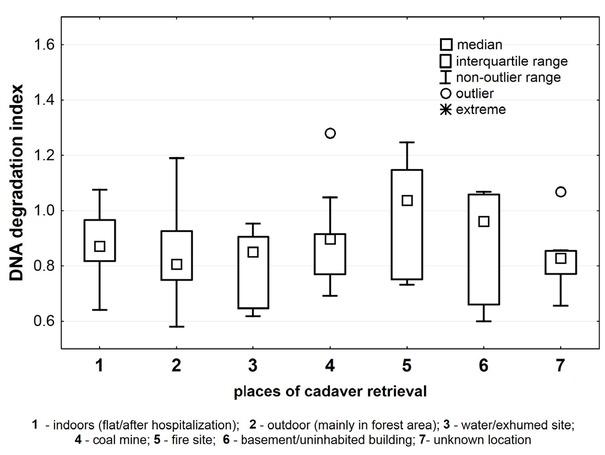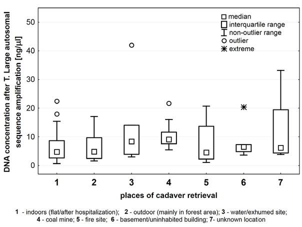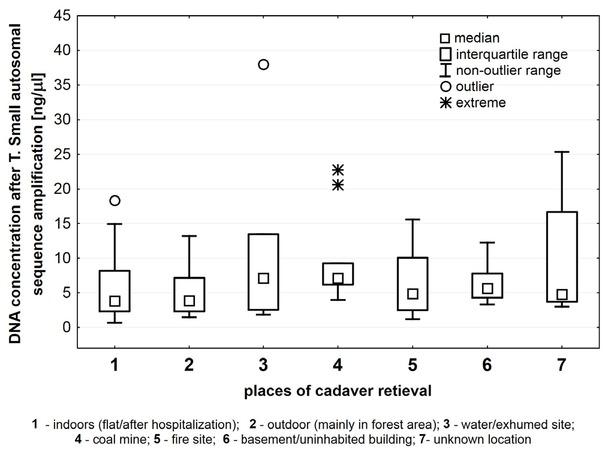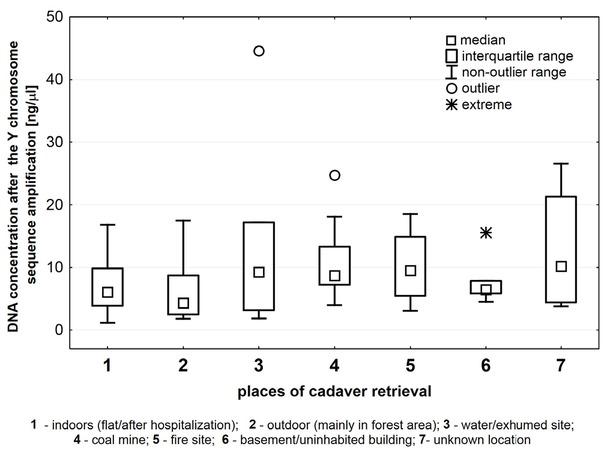 Statistical analysis of DNA concentration measured for different loci in costal cartilage samples collected from cadavers retrieved from different environments_ The results are presented as median (lower – upper quartile)_ Statistical significance was set at p > 0_05