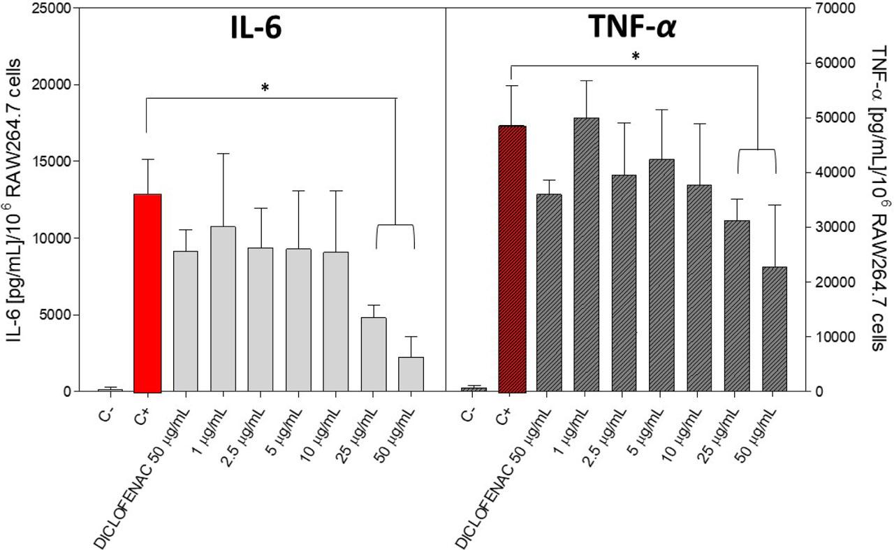 As shown in Fig. 1, control cells produced low levels of both tested proteins. The addition of LPS strongly induced production of both IL-6 and TNF-α as expected. Our results demonstrate that LevidorTM at the concentration of 25 and 50 μg/mL significantly decreased the production of both IL-6 and TNF-α (p ≤ 0.05). In contrast, diclofenac at the same concentration did not impact cytokine level significantly.